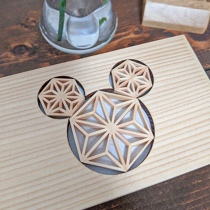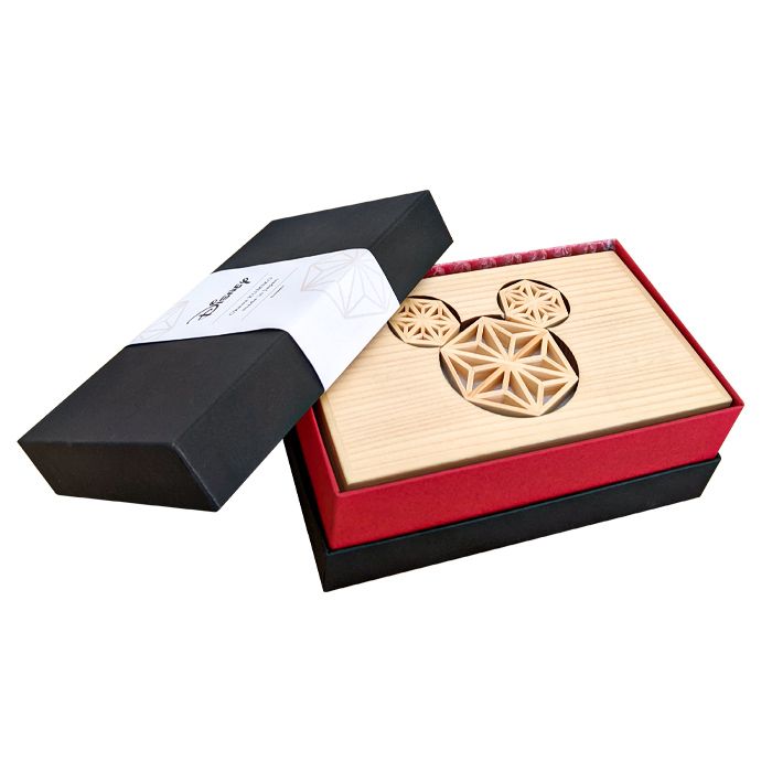 厚さ1.3~1.6㎜の繊細な組子細工「大川組子」と、ミツマルのデザインが美しい木製箱です。
