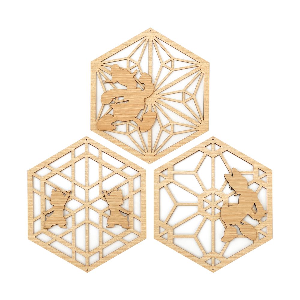 縁起の良いとされる吉祥模様をそれぞれのキャラクターにあしらったアートパネルです。