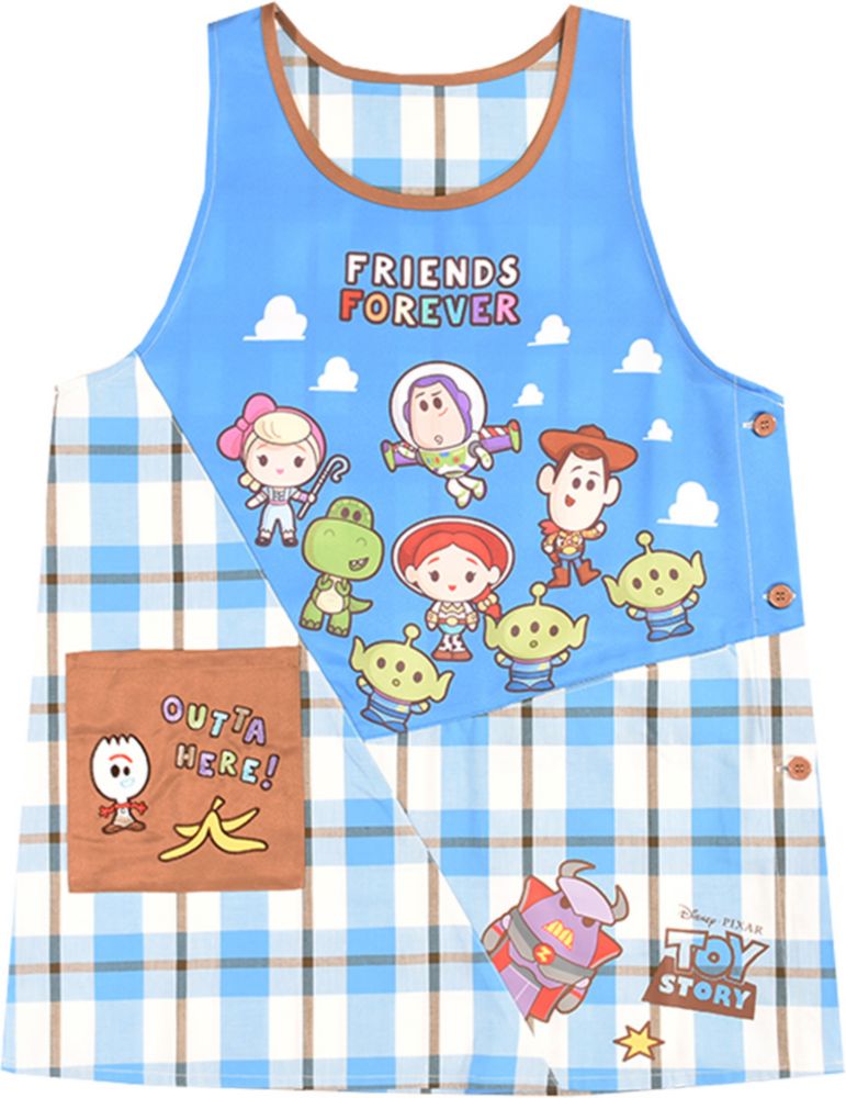 『トイ・ストーリー』の仲間たちがデザインされた大人用カバーエプロン。
