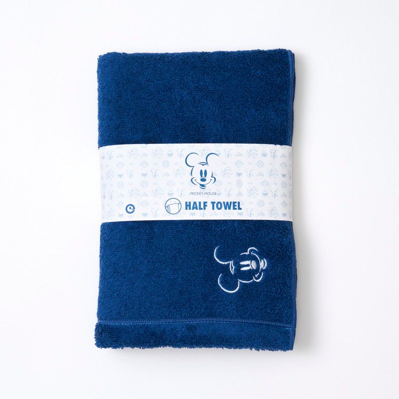落ち着いたネイビーのタオル生地に、ミッキーの顔の刺繍がポイントの大きなハーフタオル。