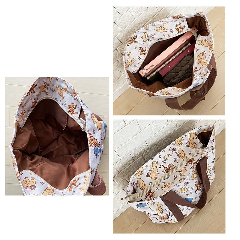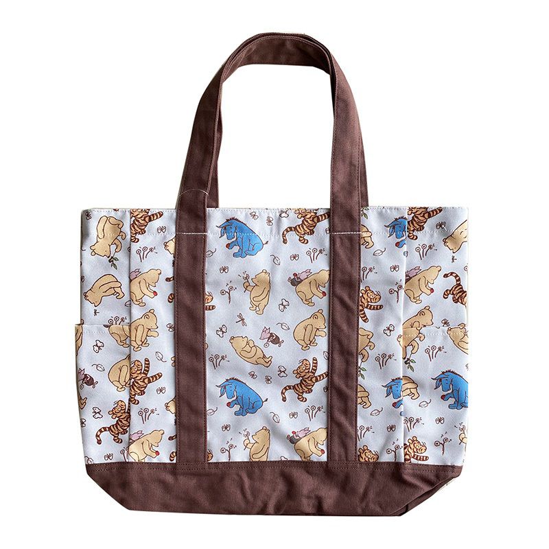 プーさんのクラシックなイラストを使用したビッグトートバッグ。総柄デザインにブラウンの持ち手がオシャレなアクセントになります。荷物がたっぷり入るので、普段のおでかけやお買い物にはもちろん、旅行バッグとしてもオススメです。