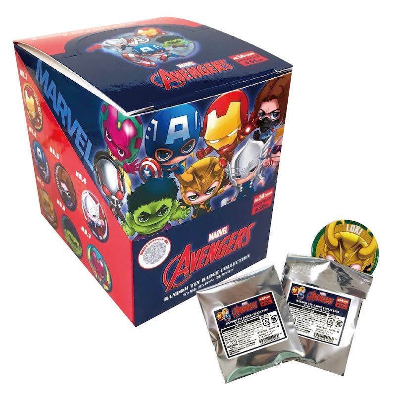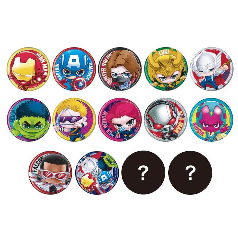 MARVEL マーベル 缶バッジ 1BOX。アベンジャーズから人気の缶バッジが登場。かわいいイラストに、背景はキラキラグリッター! バッグやお洋服に付けて、いろんなカスタマイズできます。缶バッジでオリジナルの応援グッズを作りましょう。※全14種、シークレット2種含め。本商品はBOXのみの販売となります。1BOXに全種類が揃えます。