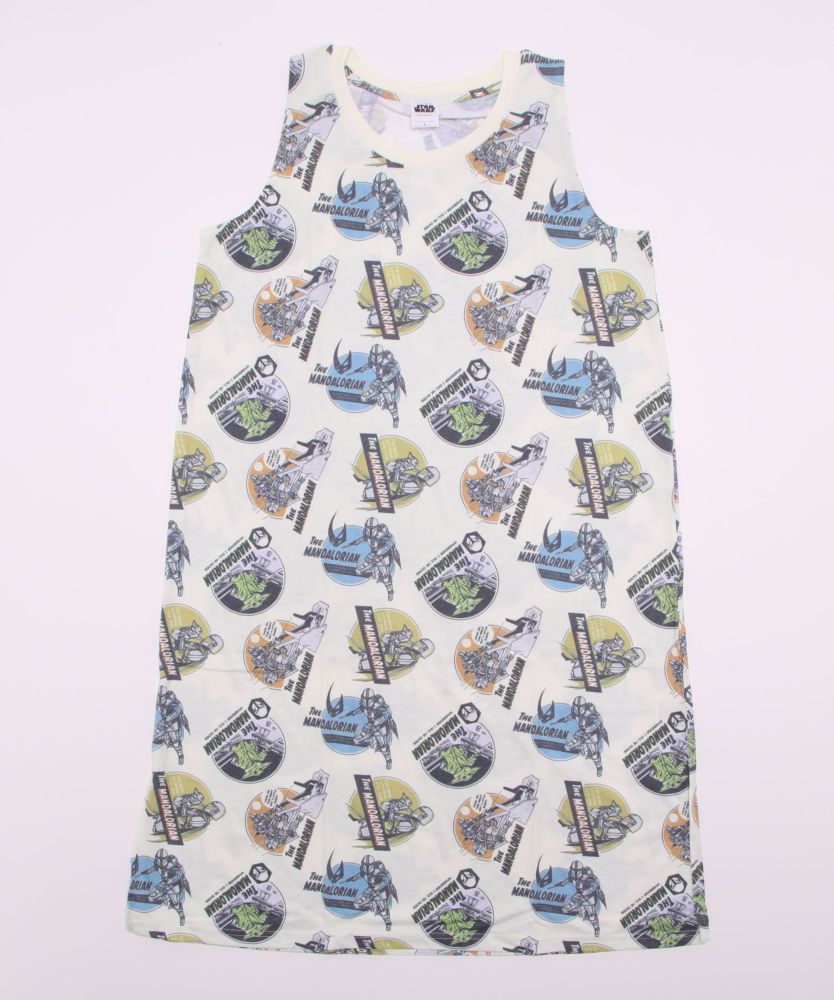 STARWARS”マンダロリアン”の総柄クールワンピースが入荷!マンダロリアンに登場するキャラクターパターンが、オシャレにプリントされたデザイン。夏らしく清涼感のあるノースリーブワンピースです♪