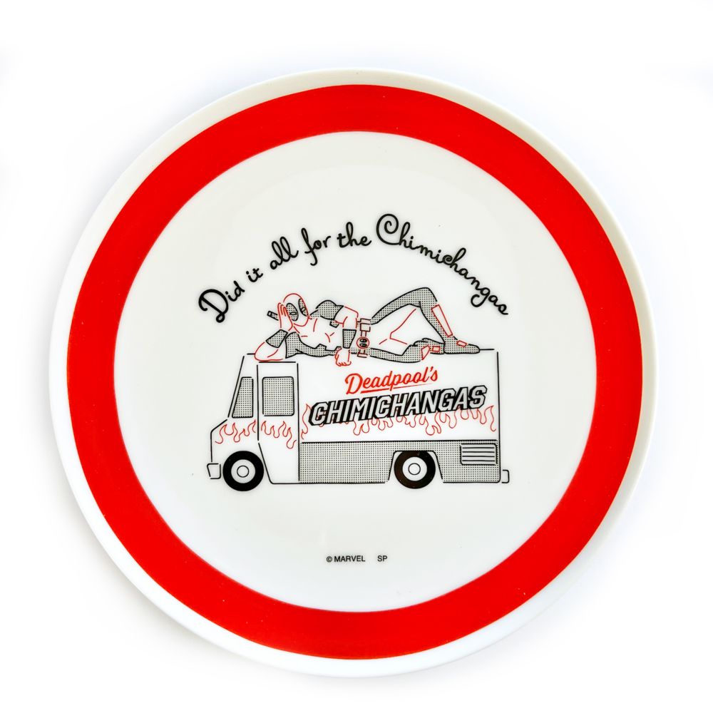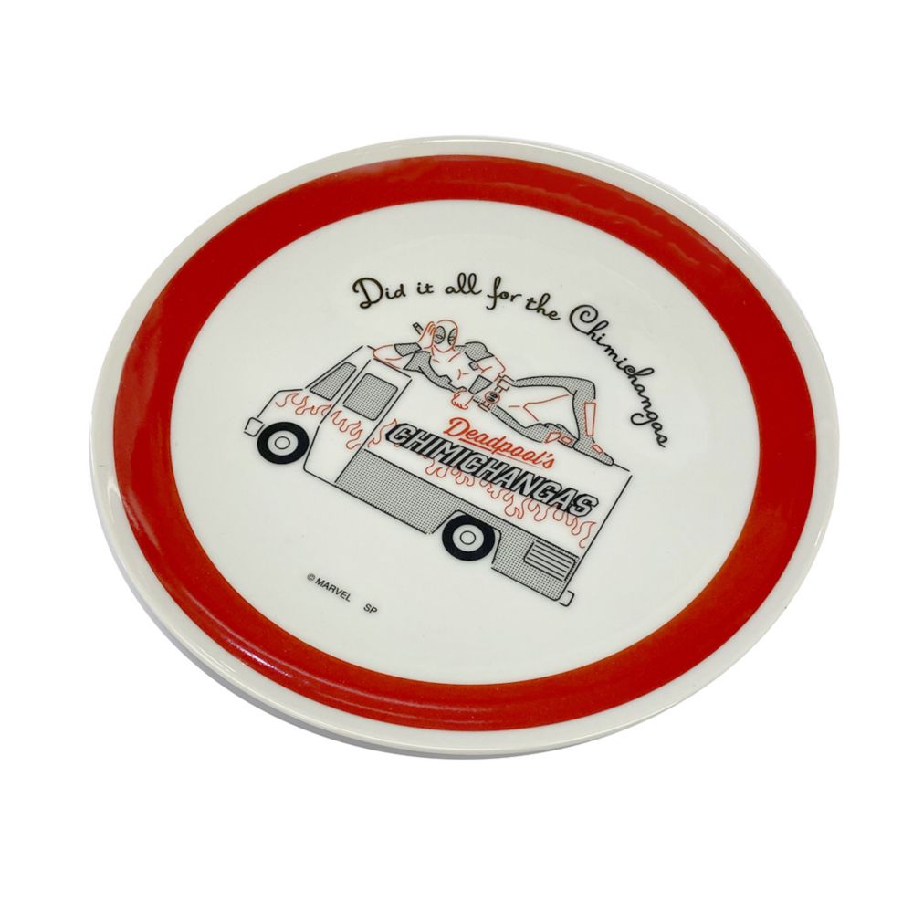 デッドプールが車の上で肘をついて横たわった、CHILLデザインのラウンドプレート。キャッチ―な描写と”CHIMICHANGAS”のロゴが目を引く、とてもかわいいデザイン!MARVELファン必見で毎日の食事時が楽しくなります。