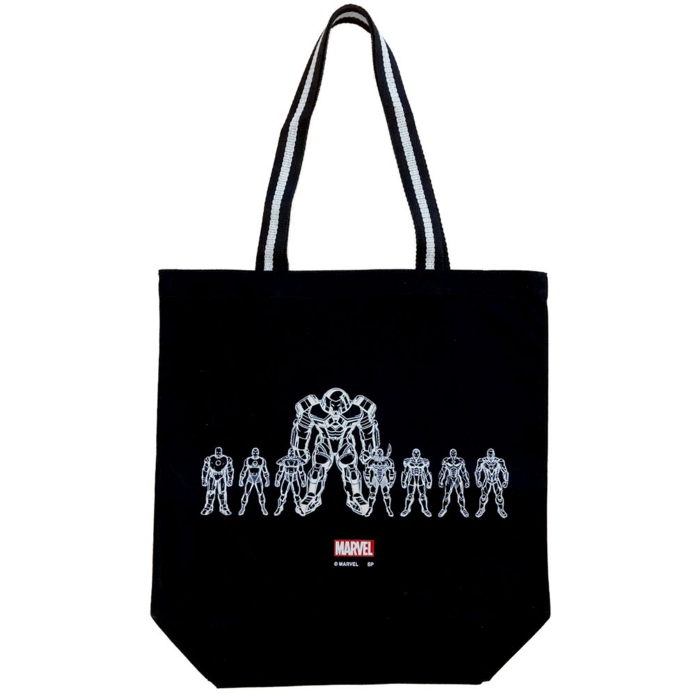 MARVEL アイアンマンのアーマーコレクションデザインのトートバッグ。ブラックベースにアイアンマンのいろんなアーマータイプが描かれたデザイン。MARVELのスモールボックスもアイキャッチになる、カッコイイトートバッグです。MARVELファンにはたまらないアイテムで、プレゼントとしてもオススメです。