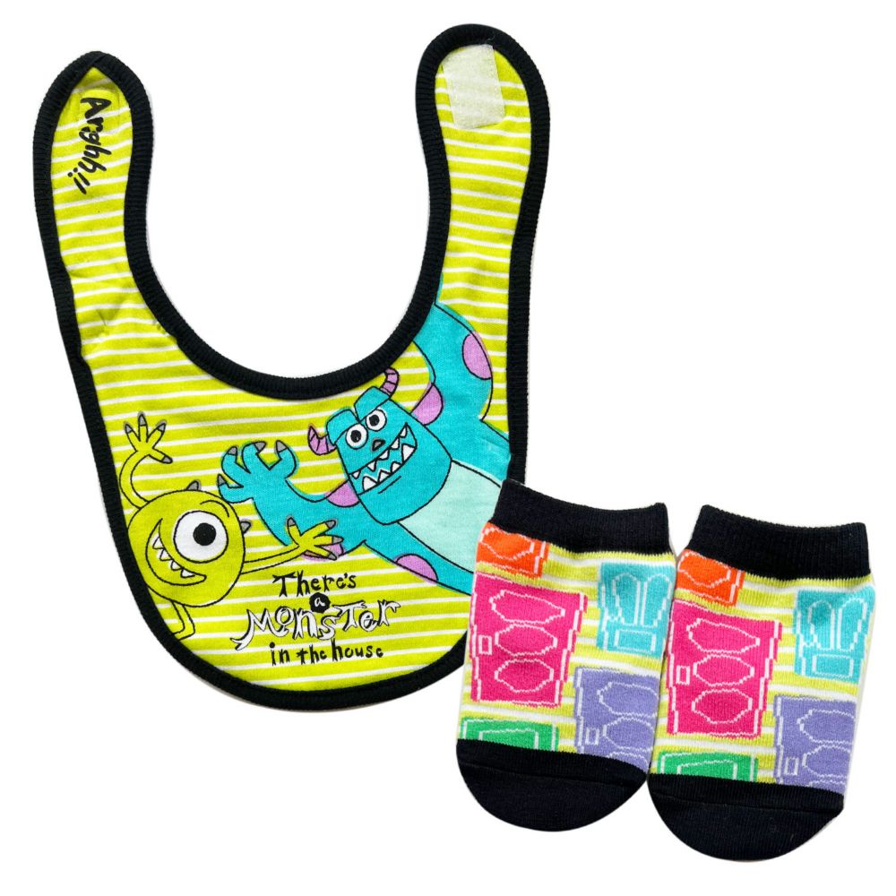 ディズニー/ピクサーキャラクターのベビーセット。ベビービブ(スタイ)よだれかけとベビーソックスのセットです。いろいろなデザインがあるので、複数枚セットもオススメ。スタイは日々使うので、ギフトに何枚あっても嬉しい必需品です。赤ちゃんやお子様にも安心、ホルマリン検査済(合格)です!(密封してあります)ソックスもお揃いでかわいいデザインです。