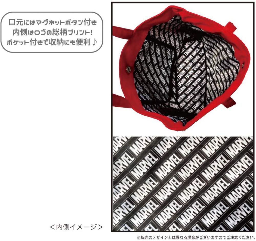 缶バッジやキーホルダー、ぬいぐるみなど好きなものを入れてデコれる、その名も「デコバッグ」。自分だけのオリジナルバッグを作れるマーベルのデコバッグです。内生地はマーベルロゴの総柄プリント☆内ポケット付きで収納もしっかりあるので普通にトートバッグとして使えます。引手がマーベルロゴになっていたりと細かいこだわりも♪