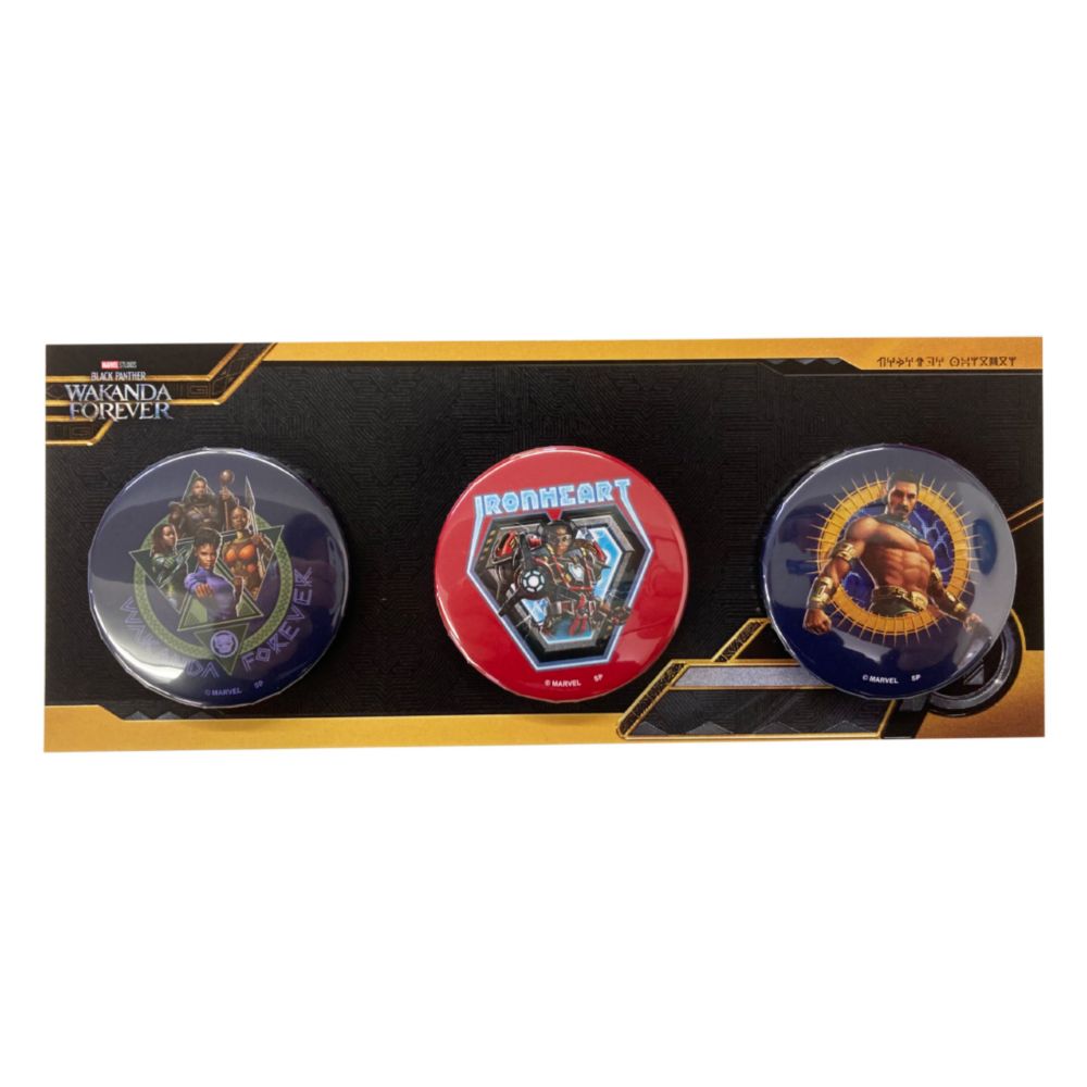 MARVEL ブラックパンサー / ワカンダ・フォーエバーの缶バッジセット。 映画「ワカンダ・フォーエバー」の主要キャラクターが描かれたカッコイイデザイン。3点1セットでバッグなどに付けたりするのはもちろん、インテリアとして部屋に並べてもオシャレな演出になります。マーベルファンには必見のアイテムです♪