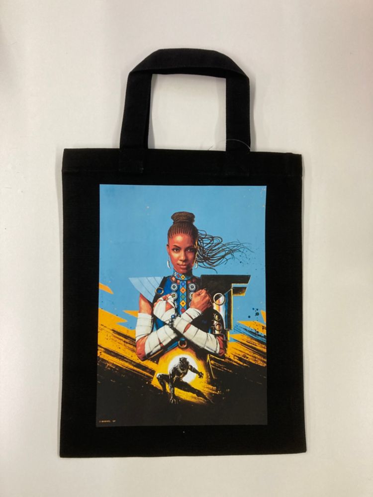 MARVEL ブラックパンサー / ワカンダ・フォーエバーのポスタートートバッグ。 映画「ワカンダ・フォーエバー」の1シーンを思わせる、シュリが大きくプリントされたデザインです。普段使いのサブバッグとしても色々なシーンで活躍します。マーベル女子にもオススメのアイテムです♪