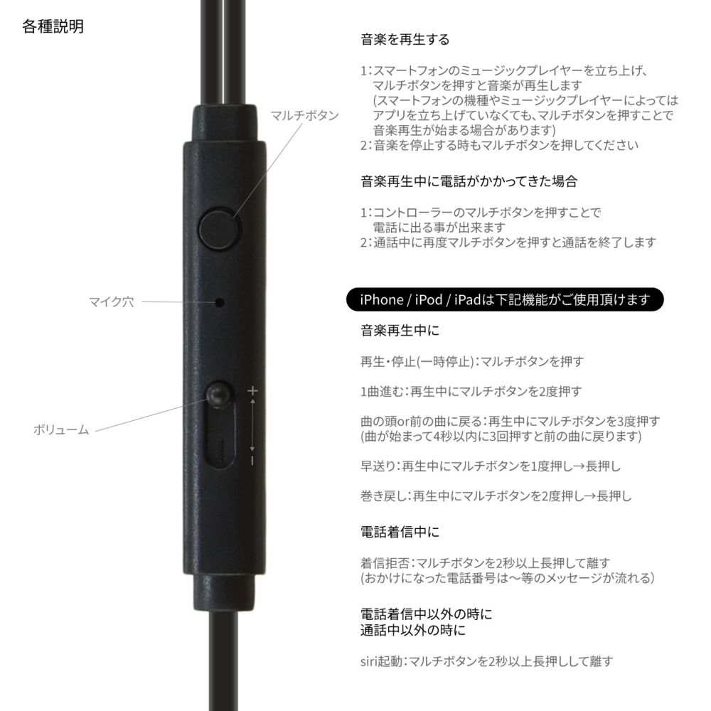 リモコンマイクを搭載しており、音量調整や再生/停止/スキップなどのリモコン操作や通話時にはマイクを使用可能です。