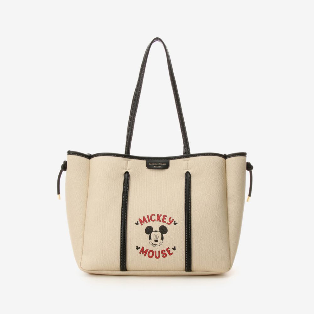 「ミッキー」のレトロ調のカラーリングのアートがポイントのトートバッグ。ストラップを引っ張ることで、バッグのフォルムチェンジもできます。