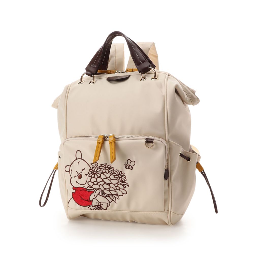 「プーさん」が花束を持ってニッコリとした笑顔のアートがポイントのリュック。
