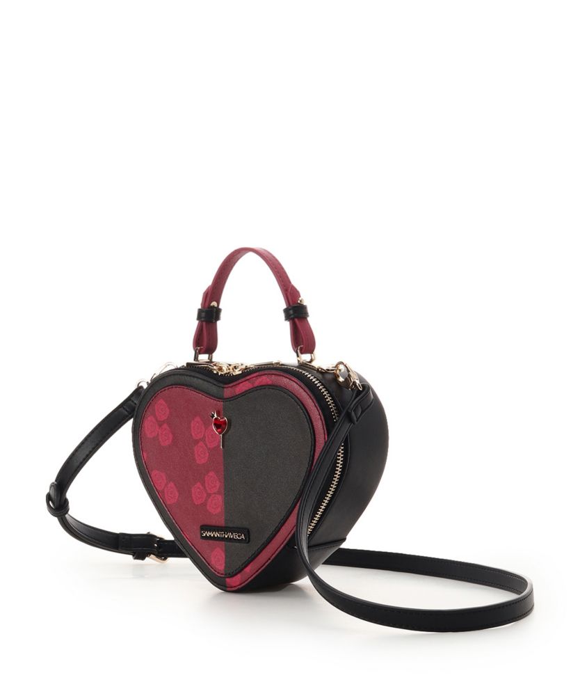 ・バラのプリントと、クイーンモチーフのハートビジュー金具がポイント。