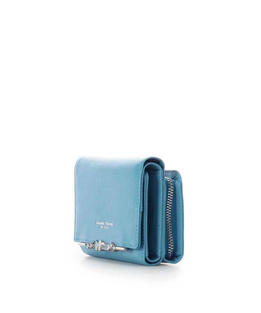 ライトブルーのレザーに、青い炎や髑髏、デジタルエフェクトなどのモチーフを集めた金具を合わせたデザイン。