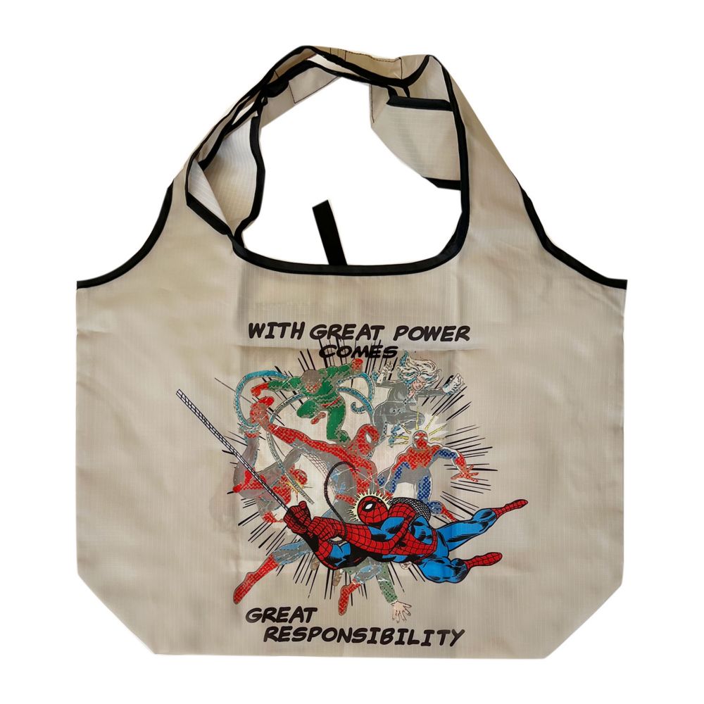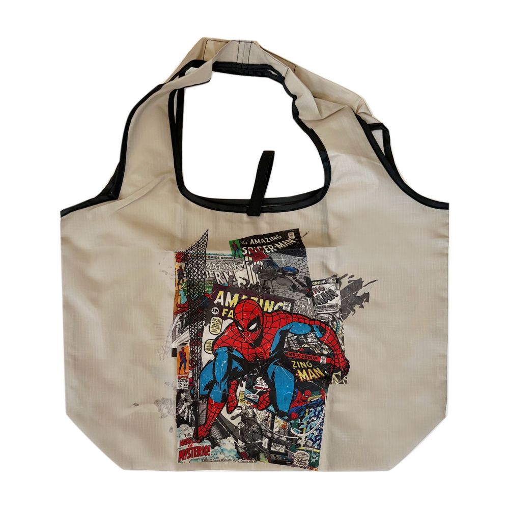 MARVELから総柄デザインの”くるくるショッピングバッグ”が登場!お買い物や旅行に便利な小さくまとまるエコバッグ。底マチもあり、レジ袋の代わりなどにもピッタリ! 使わない時はクルクルたたんで同じデザインの小さい収納袋に入れる事ができて便利!軽い素材だから気軽にバッグに入れておけます。