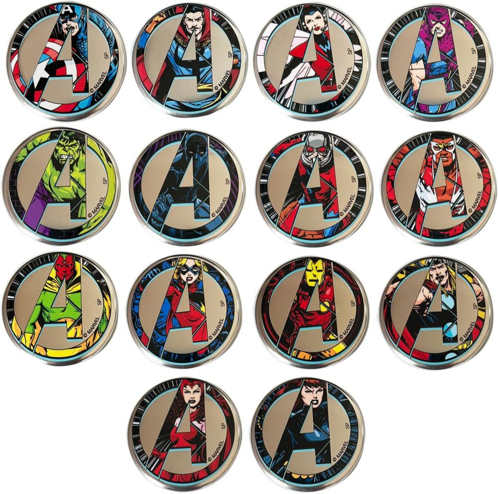 《東京コミコン2023 先行販売商品≫マーベル原作コミック版「アベンジャーズ」 60周年デザインのブラインド缶バッジ。全14種の単品です。