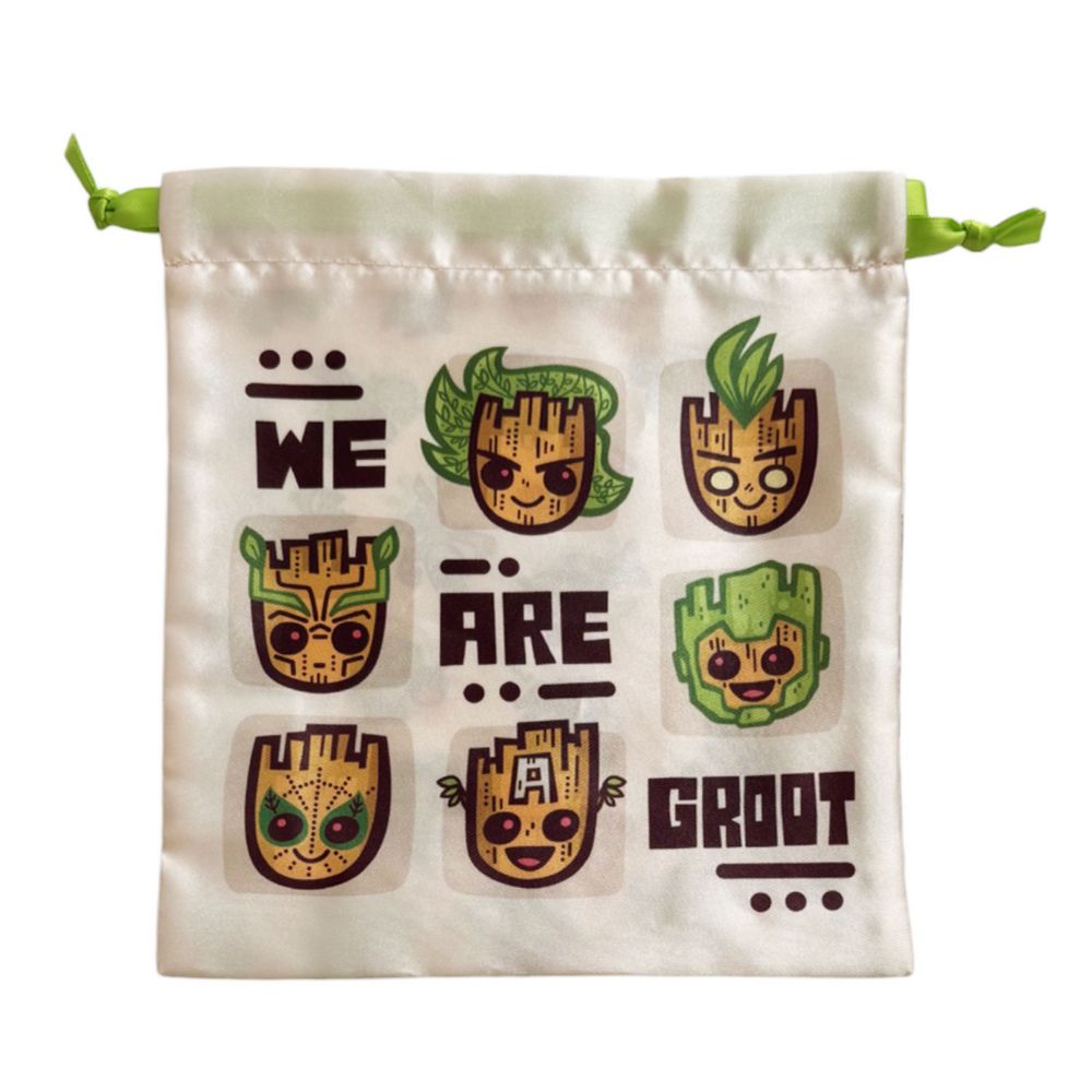 デフォルメされたグルートがアベンジャーズなりきりのかわいいサテン生地の巾着。やわらかで上品な光沢のサテン生地で、小物入れに最適なリボン結びデザインです。小さなものを整理、収納するのにピッタリ。プレゼントにも喜ばれるアイテムです。