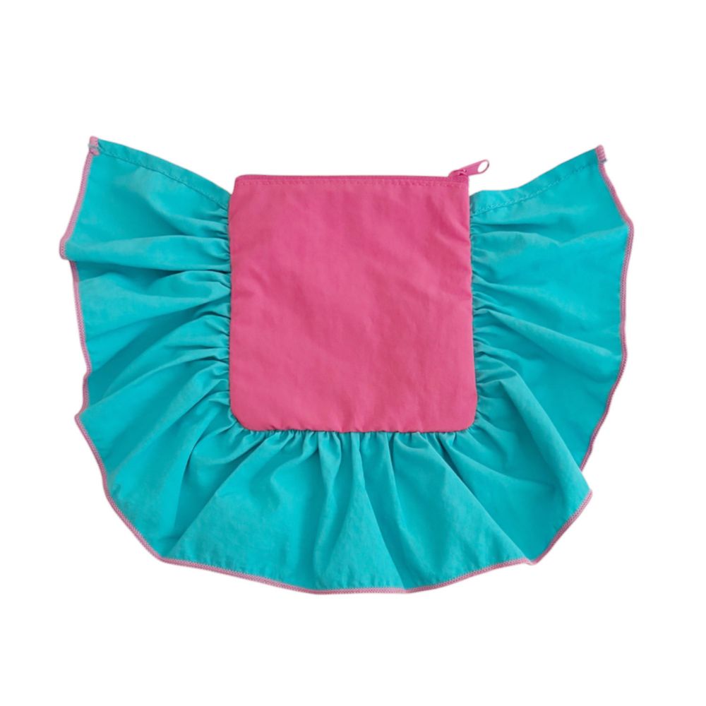 フリルデザインがフェミニンで可愛らしを演出。メイク道具等をいれてコスメポーチとして使うのはもちろん、ちょっとしたステーショナリー入れにしたり、色々と便利にお使いいただけて可愛いポイントになります。