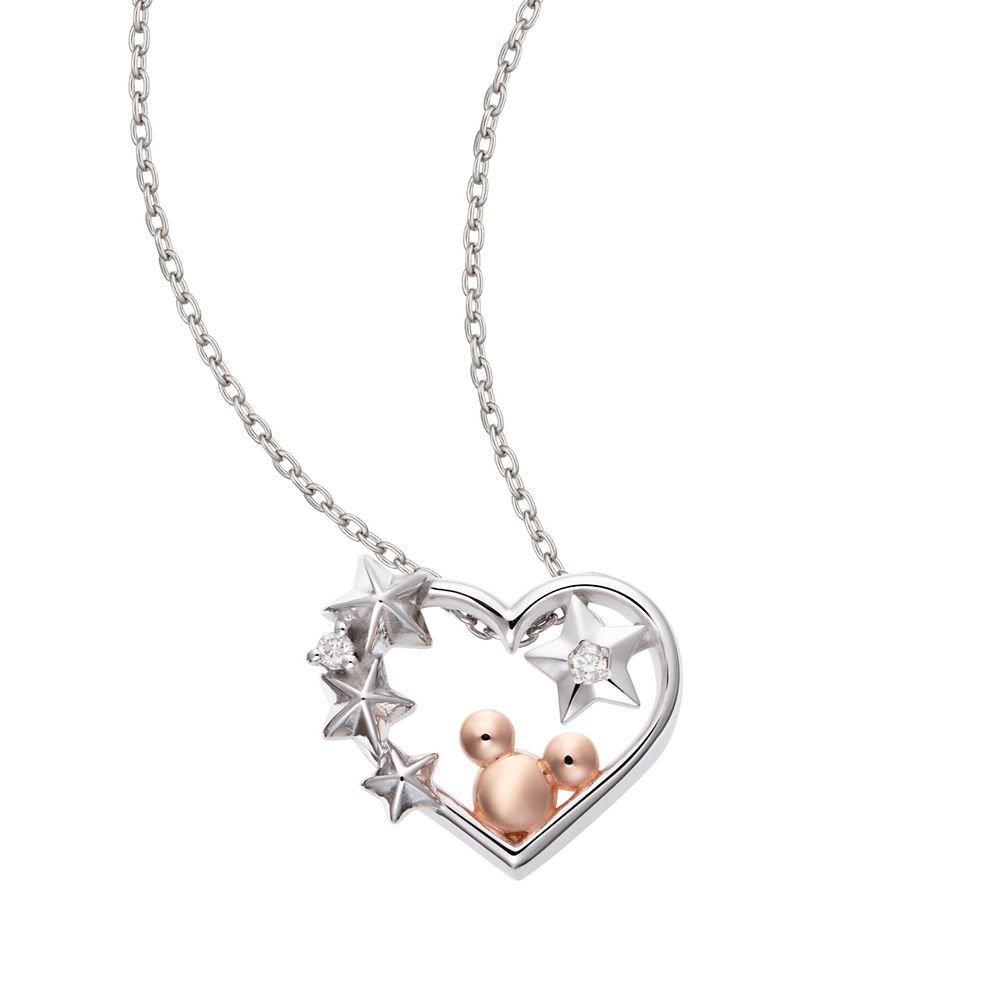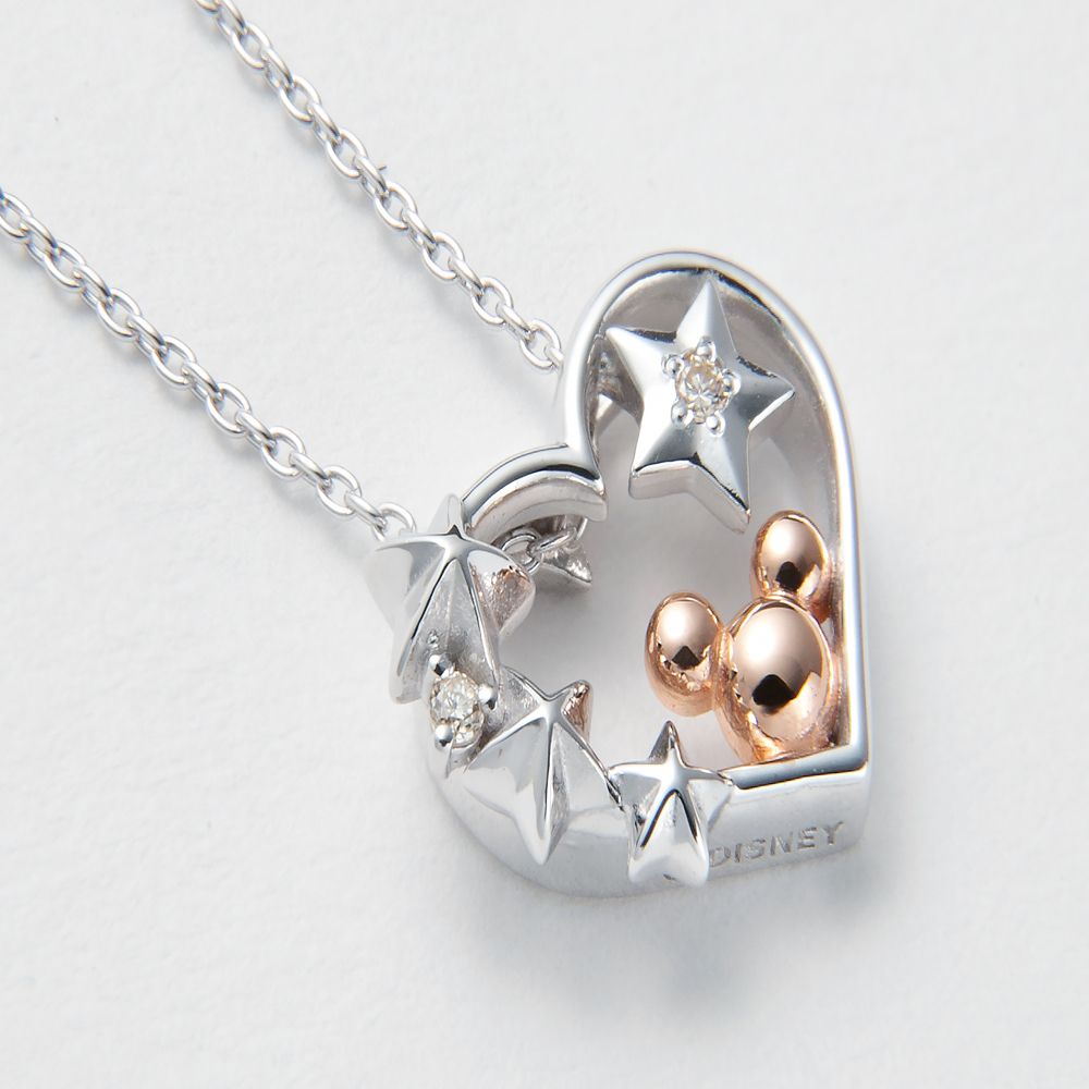 オープンハートの中に星形のダイヤモンドとミッキーのシルエットが浮かぶペンダント。