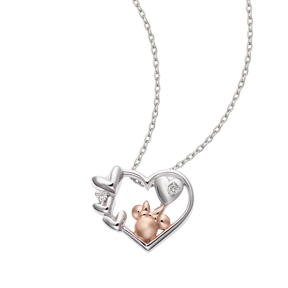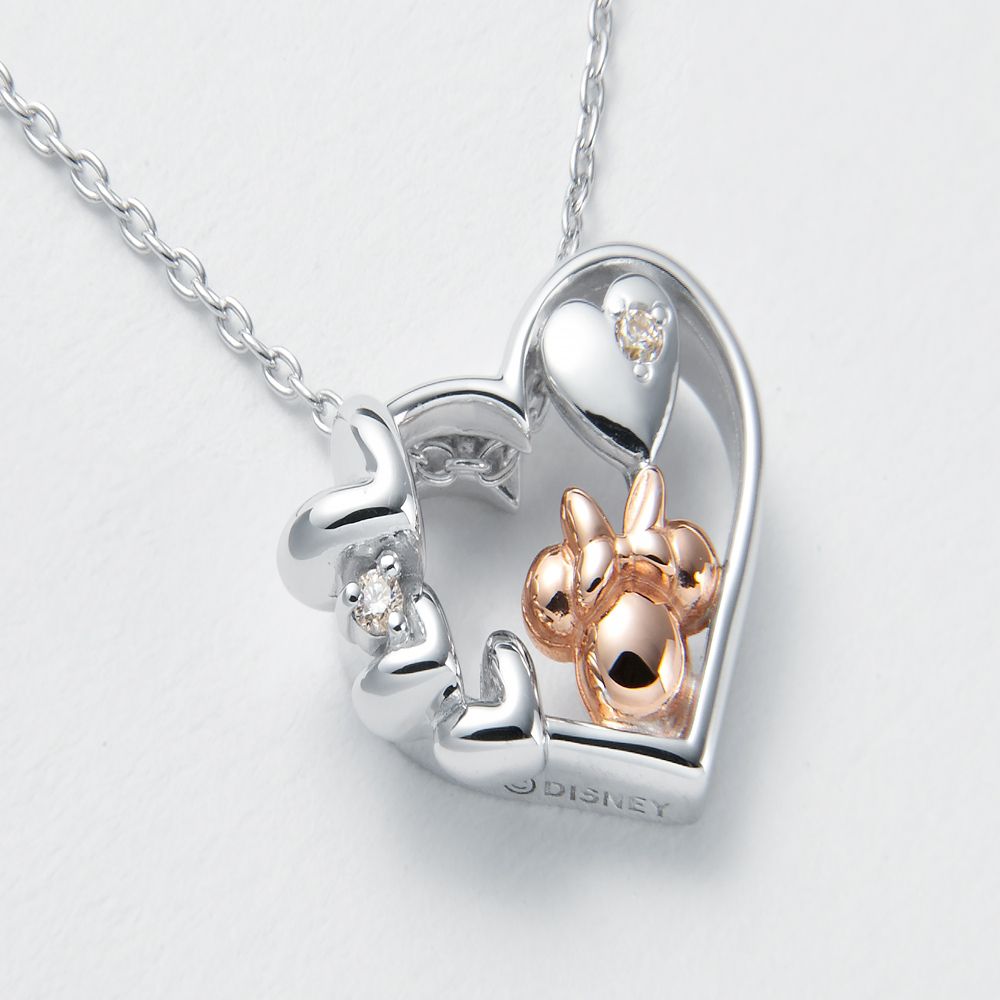 オープンハートの中にハートのダイヤモンドとミニーのシルエットが浮かぶペンダント。