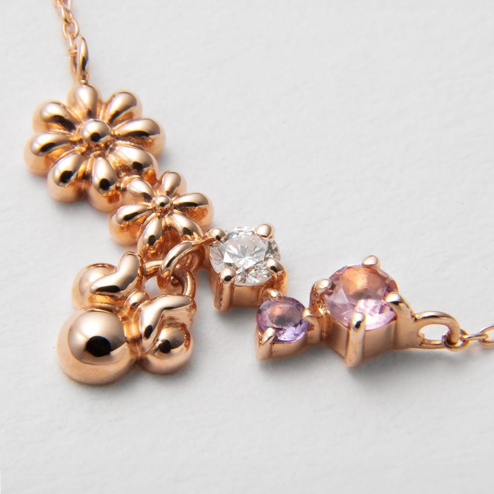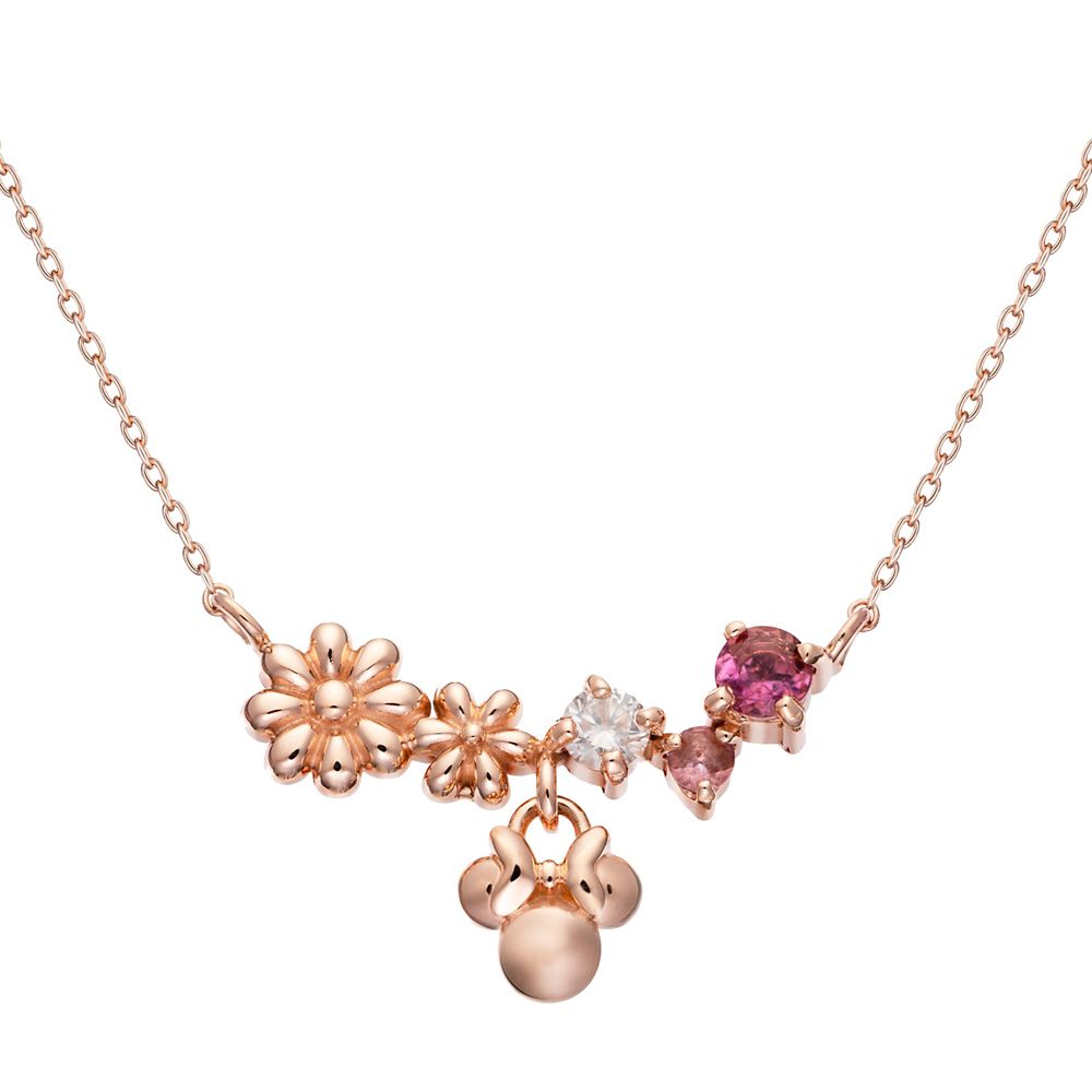 上品なピンクゴールドの輝きとミニーのモチーフが揺れる大人も楽しく着けられるジュエリー。