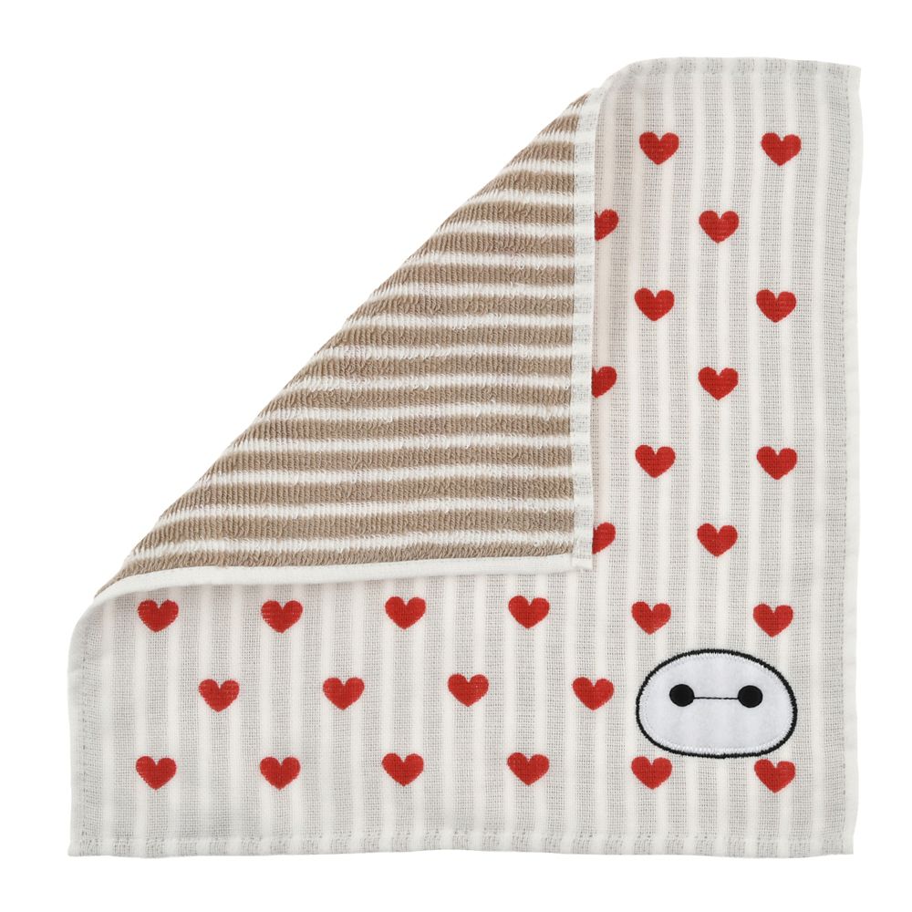 やわらかな風合いのミニタオル。表面はガーゼ素材、裏面はパイルでふんわりした手触りのタオル生地です。ベイマックスらしいハート柄にキャラクターフェイスのアップリケ刺しゅうを添えて、ディズニーならではの遊び心をプラスしています。