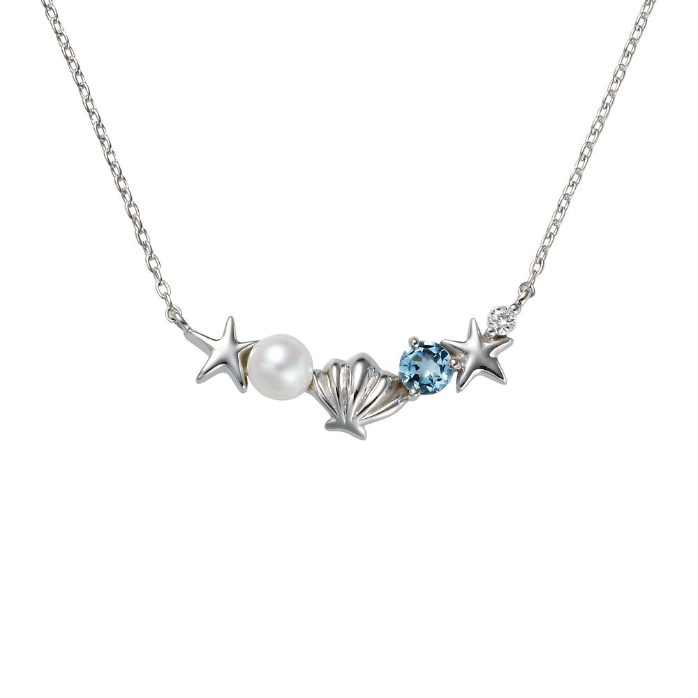 トップ:K10WG、ロジウムメッキ/ダイヤモンド0.01ct、アクアマリン、淡水パール/チェーン:K10WG