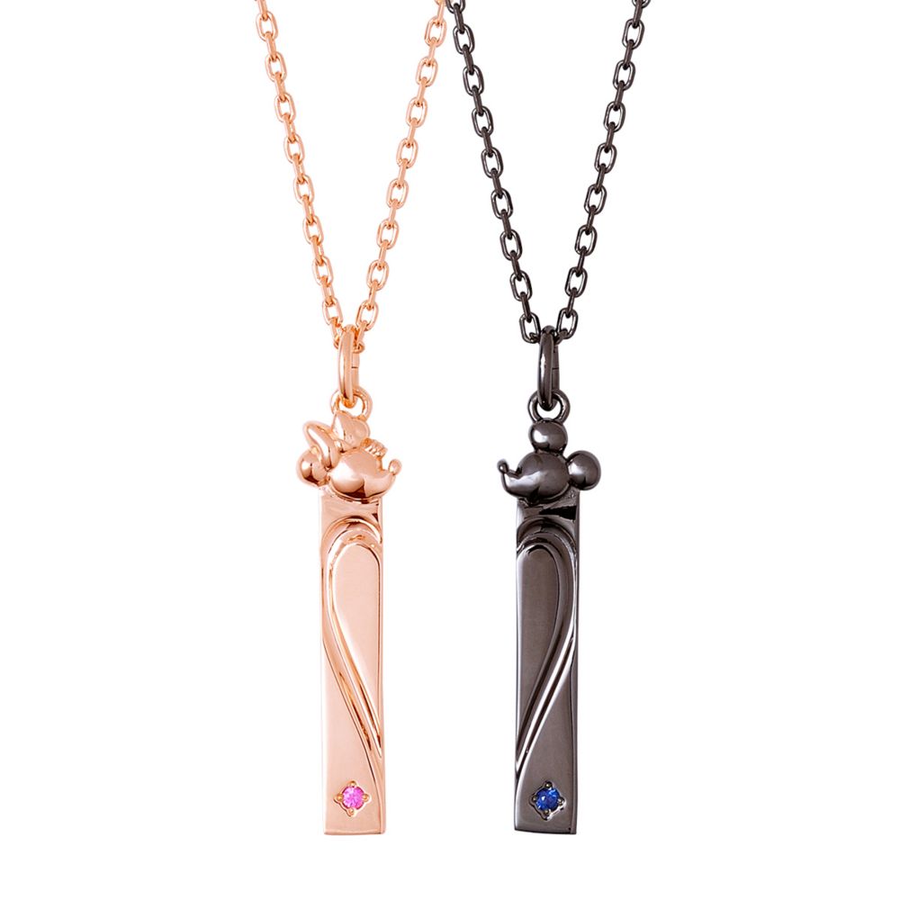 レディースとメンズのネックレスを近づけると、ミッキーとミニーが鼻でKISSをするキュートなデザイン。