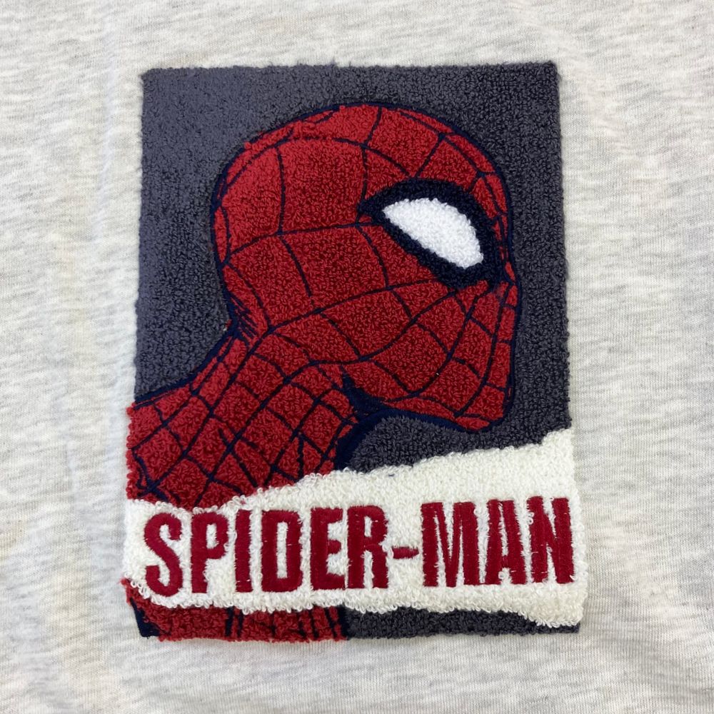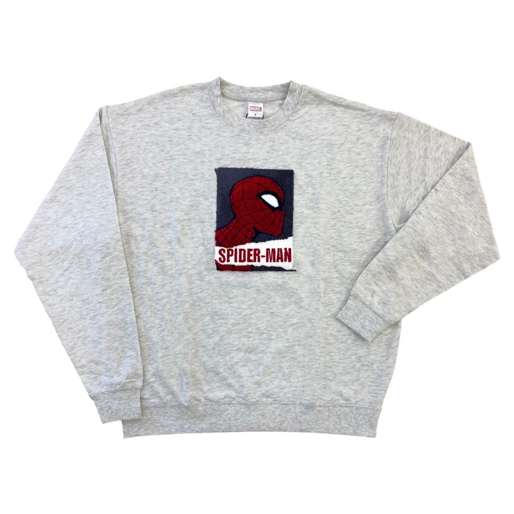 MARVELアパレルシリーズ。スパイダーマンの横顔がフェイスがサガラ刺繍で表現された裏毛クルーネックスウェット。MARVELファンにはたまらないスタイリッシュなデザインです。