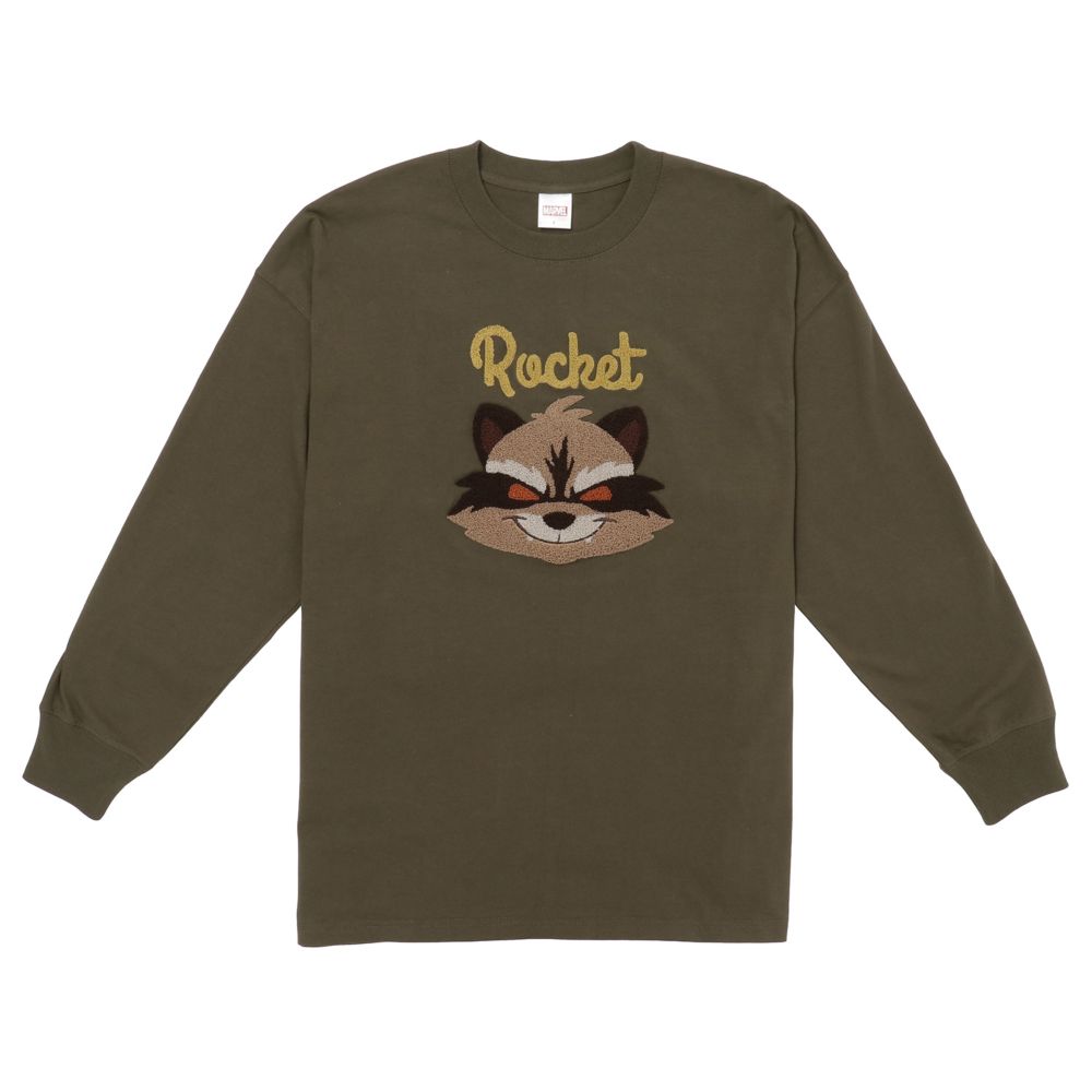 MARVELアパレルシリーズ。胸に「ロケット」のフェイスをサガラ刺繍で施したロングスリーブTシャツ。MARVELファンにはたまらないスタイリッシュなデザインです。