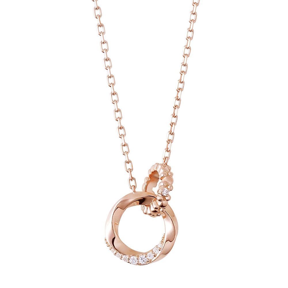 小さなミッキーアイコンが連なる、遊び心あふれたダブルリングのペアネックレス。
