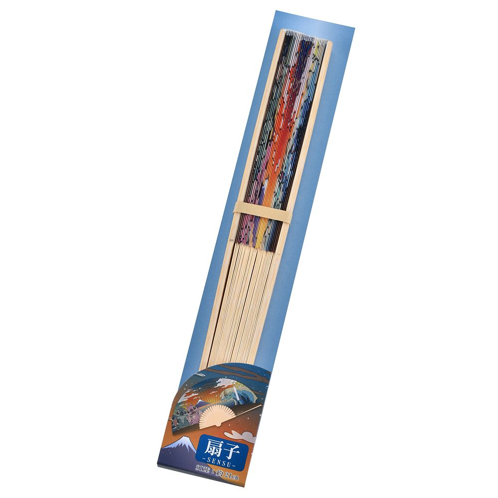 富士山を背景にして記念撮影するスティッチとエンジェル、波にさらわれたスクランプが可愛らしく描かれた扇子です。