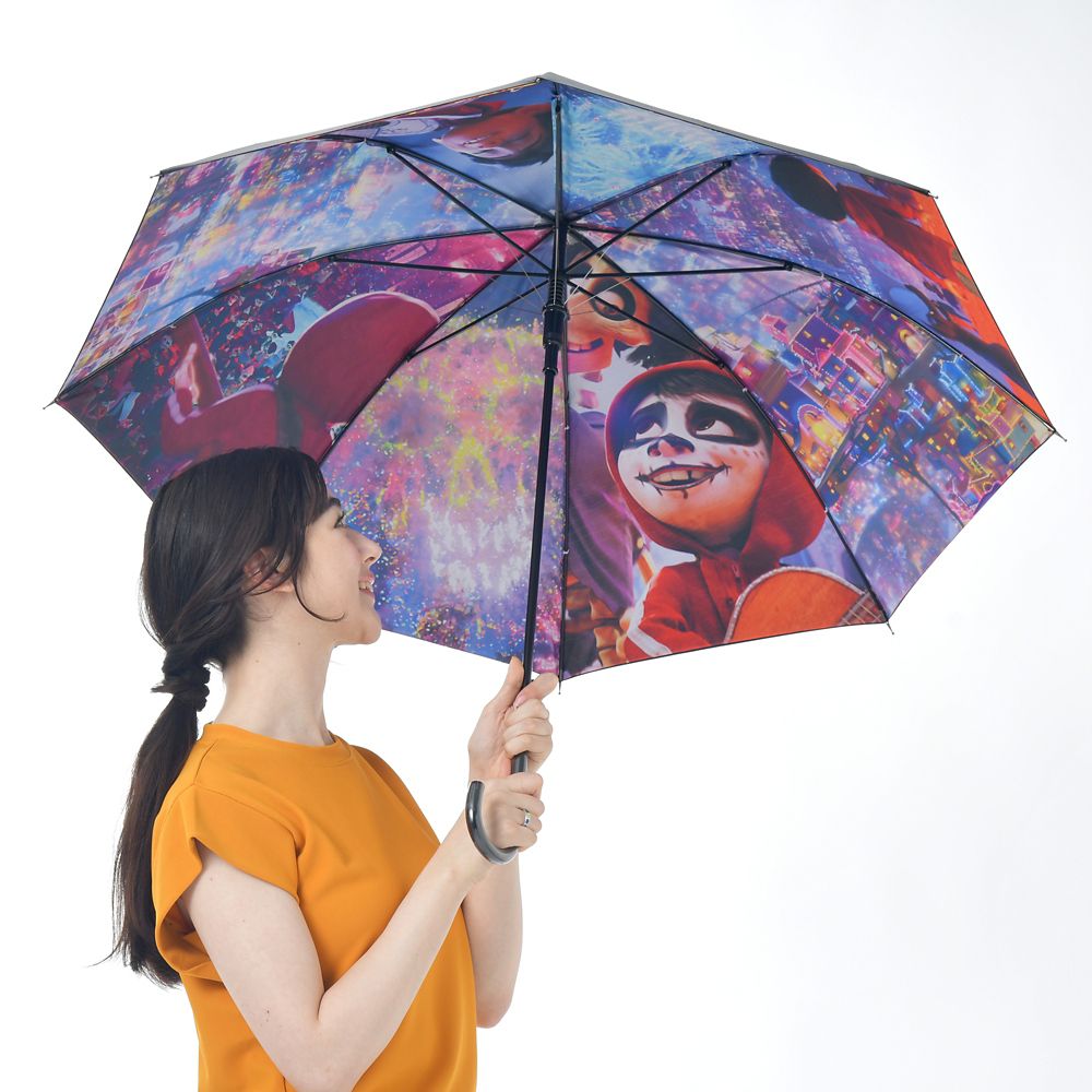 シックな無地傘は、開くと内側に、『リメンバー・ミー』の愛と音楽あふれるカラフルな<死者たちの世界>が。