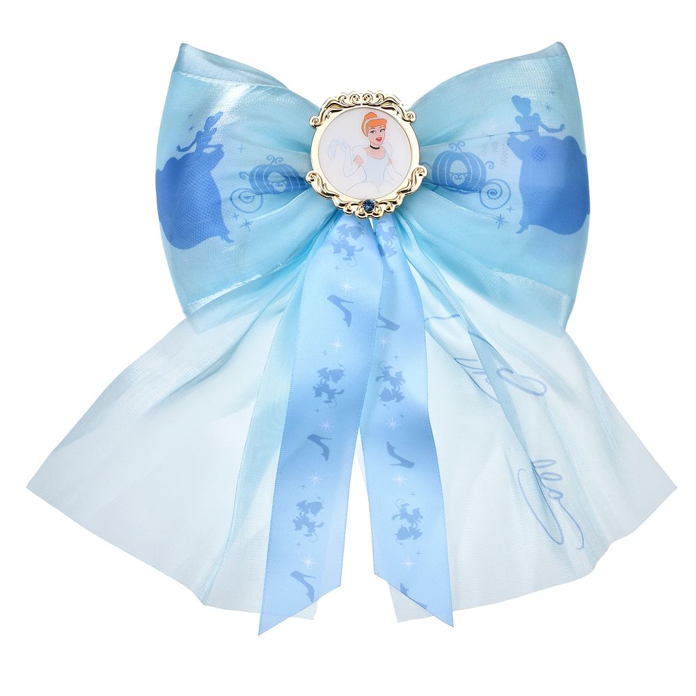 パッと目を引く大きなリボンバレッタ。シンデレラのサインやキャラクターシルエットがプリントされています。