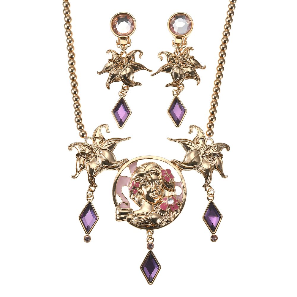 キャラクターフェイスをあしらったボリューミーなネックレスと、ストーンの下で魔法の花が揺れるイヤリングのセットです♪