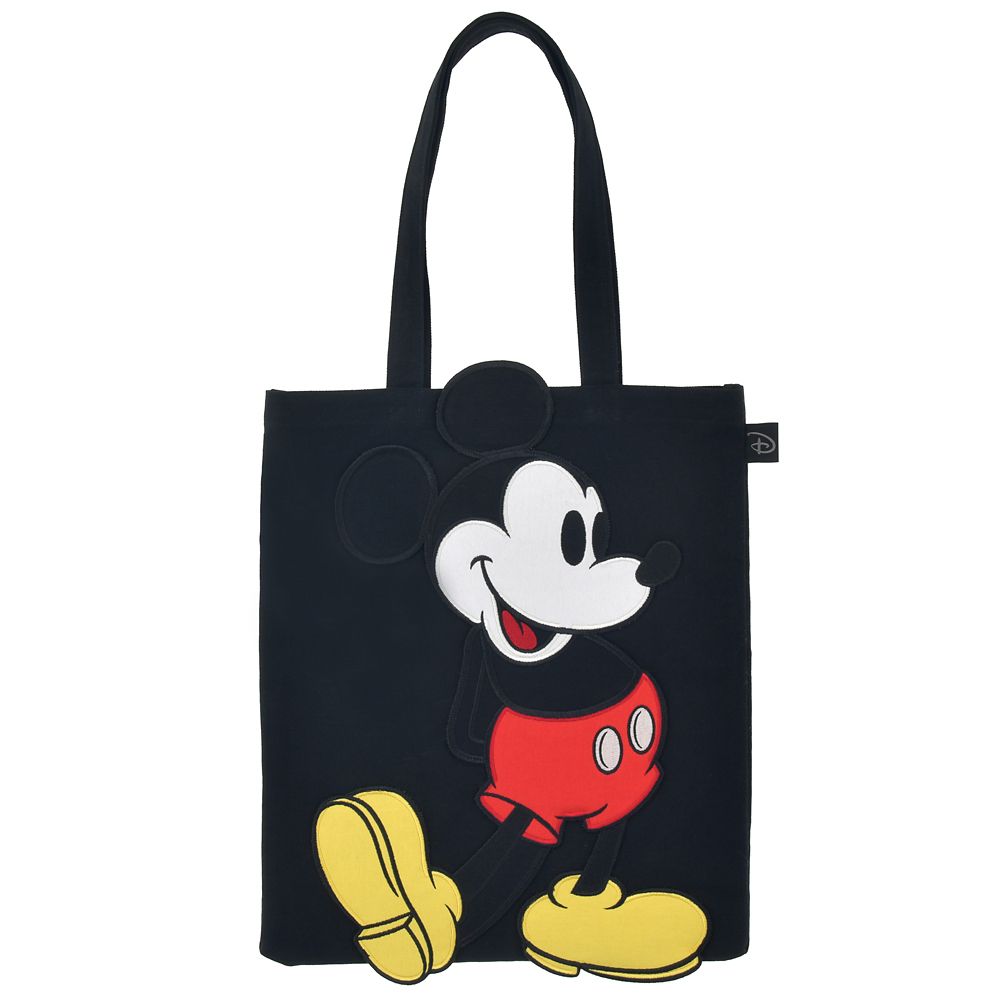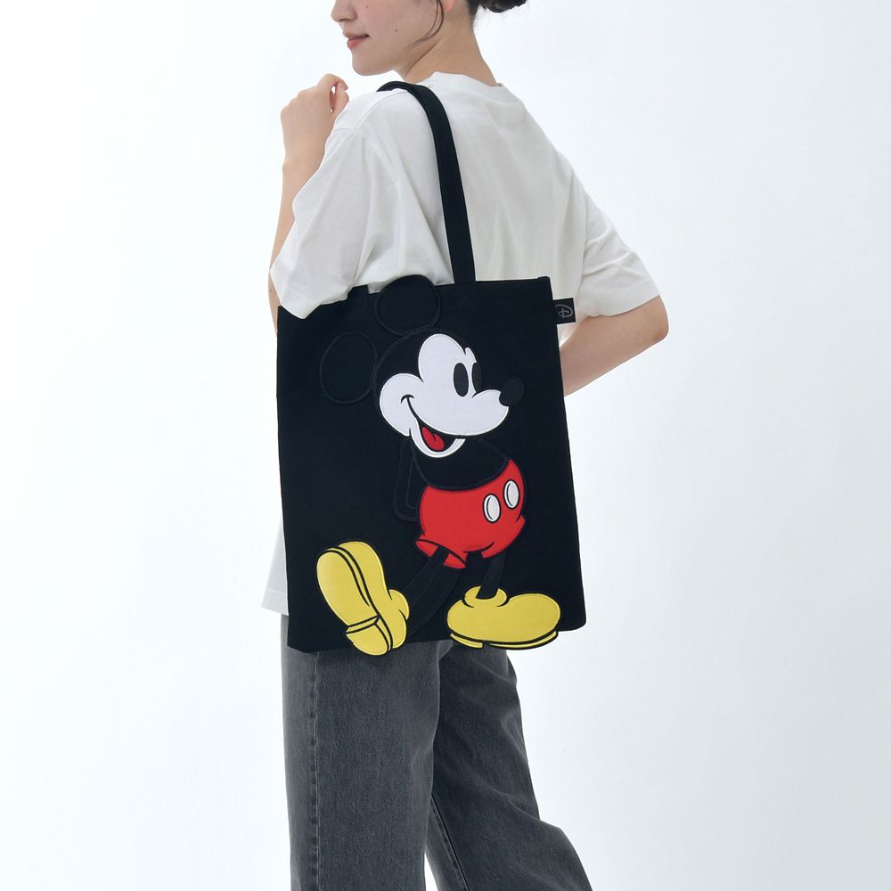 カジュアル素材のバッグに定番のスタンディングアートを大胆に配置。パッチワークと刺しゅうで表現されたミッキーは存在感抜群です。