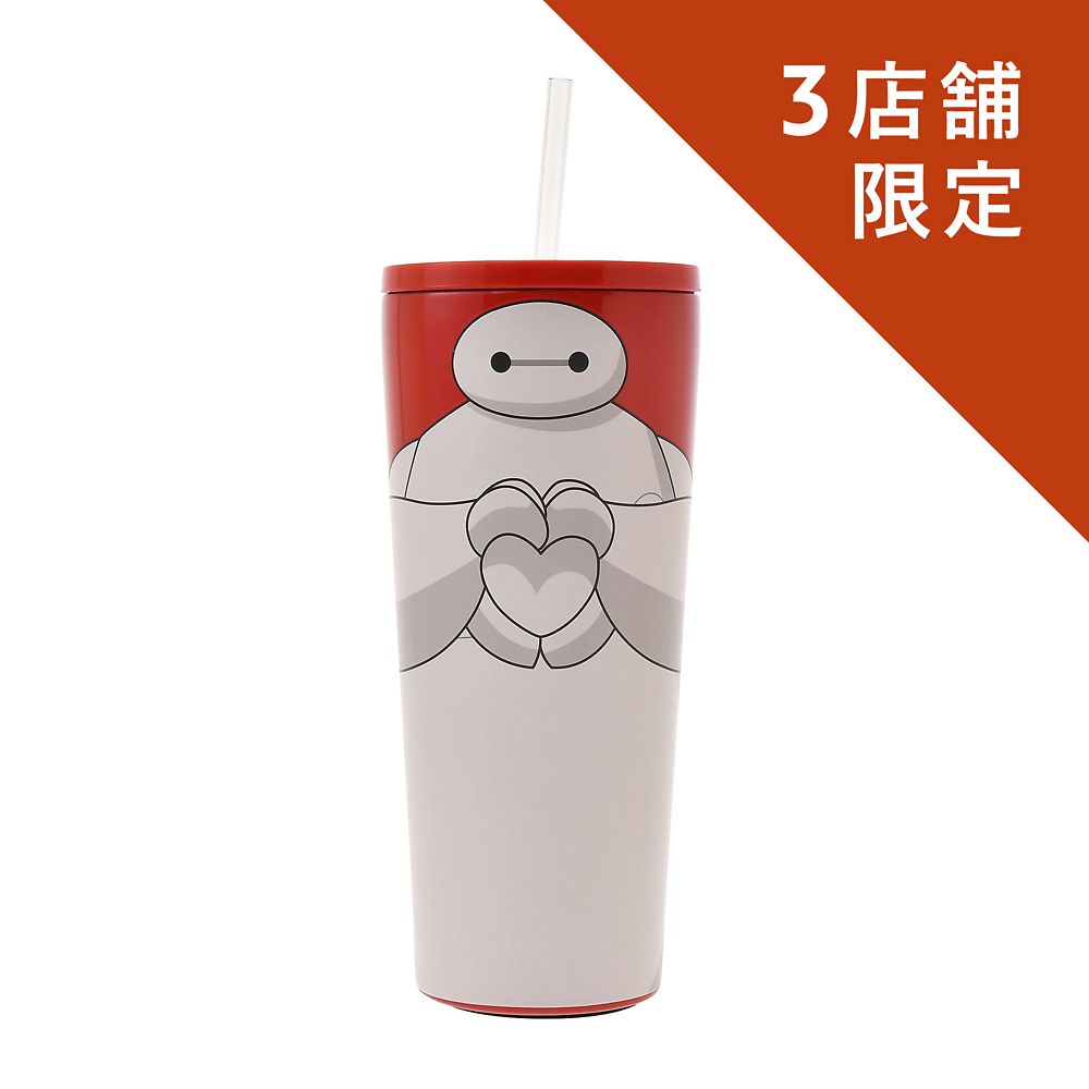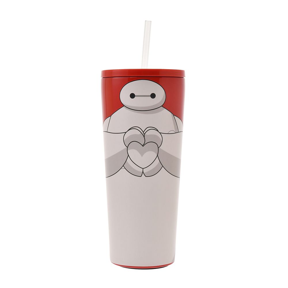 キャラクターらしい赤色のステンレス製タンブラー。手でハートマークを作るベイマックスが大きくプリントされています。