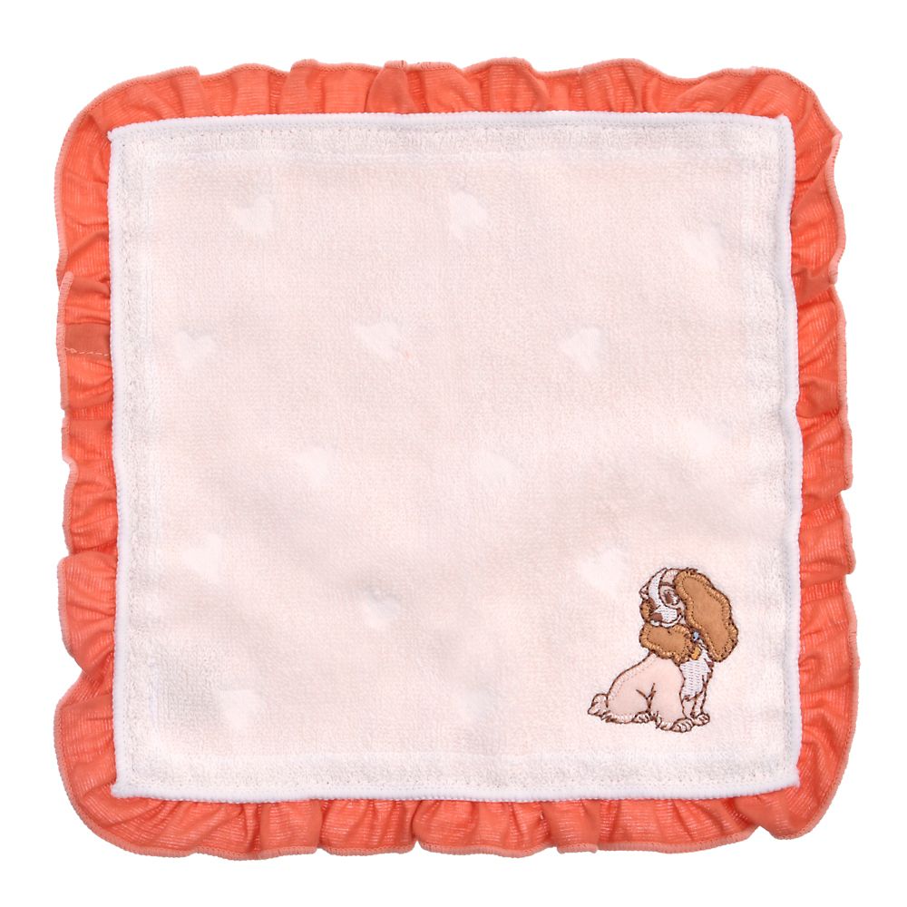 キャラクターのアップリケ刺しゅうがアクセントになった、ハート柄のミニタオル。フリルの縁取りがおしゃれで可愛いポイントです♪