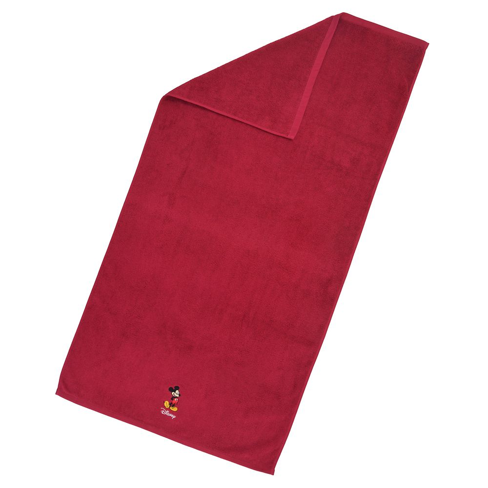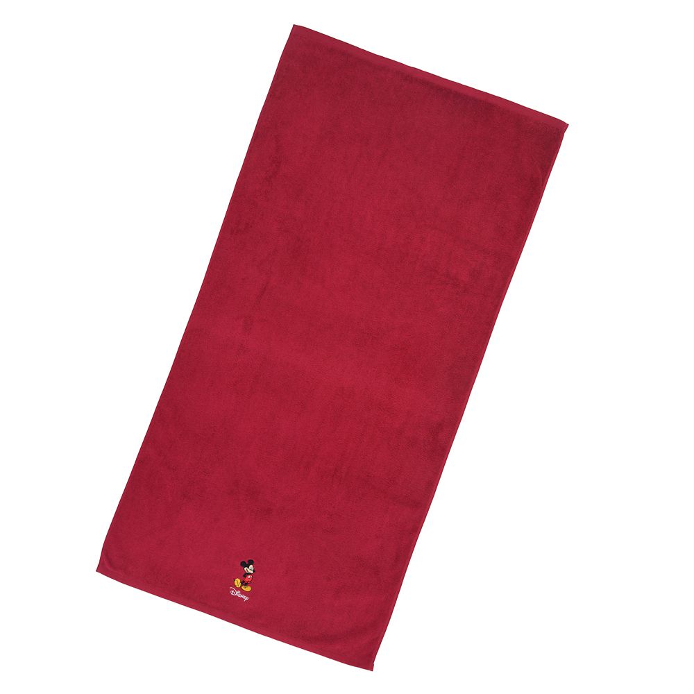 ミッキーのワンポイント入り。赤色のバスタオル。