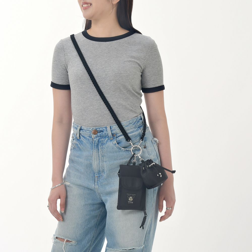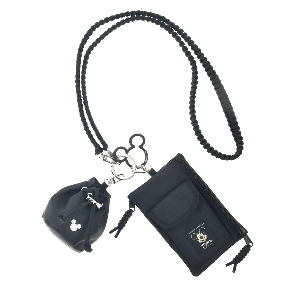 ロゴとキャラクターフェイスの縫い付けがアクセントになったミニショルダー、シルバーカラーのパーツがアクセントになった巾着ポーチ、ミッキーアイコン形のカラビナ、肩にフィットしやすく使い心地が良いパラコードを編んだデザインのストラップが、丸形カラビナでひとつになっています。
