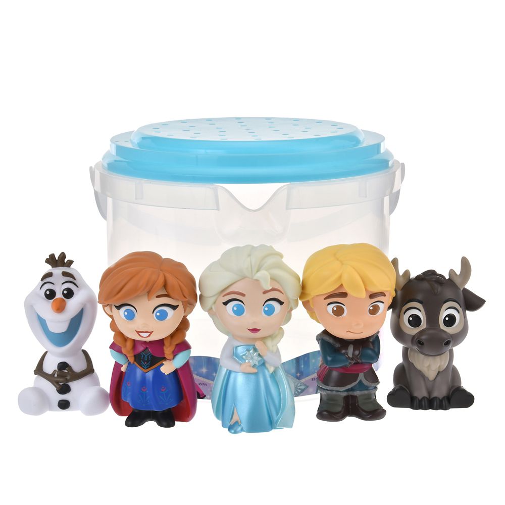 アナ、エルサ、オラフたちの可愛らしいフィギュアと、蓋付きバケツ型ケースのセット。