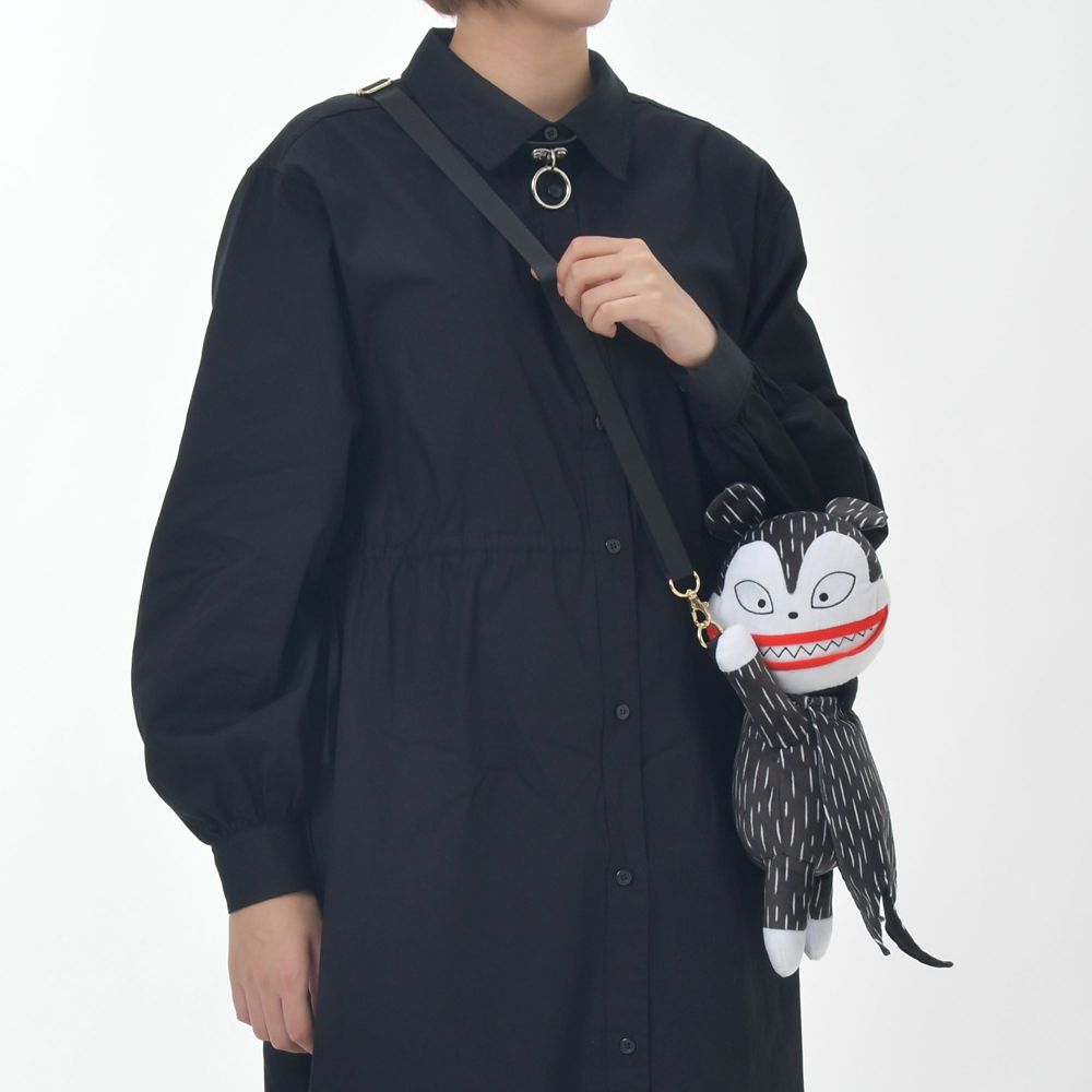 首の後ろが開口部で、中に小物を入れられます。付属のストラップは長さ調節が可能なので肩掛けも、斜め掛けもできます。