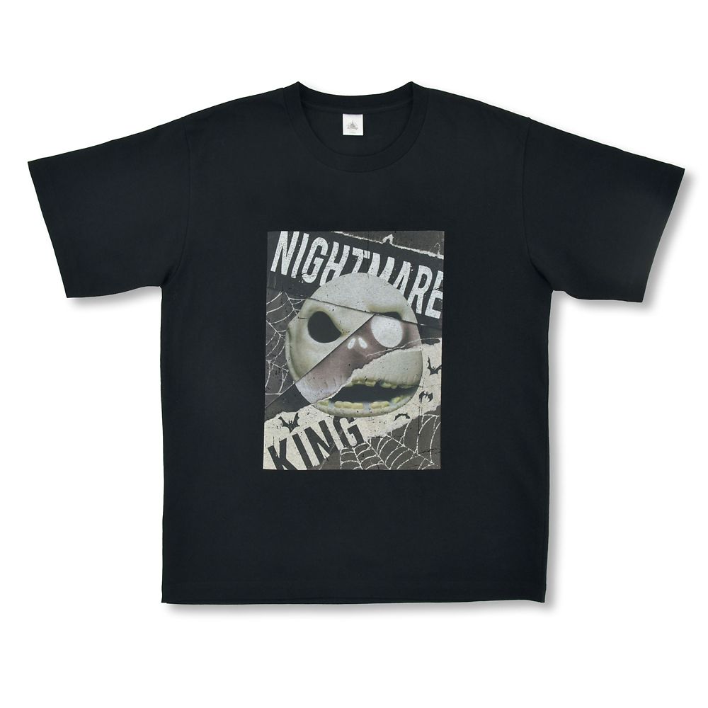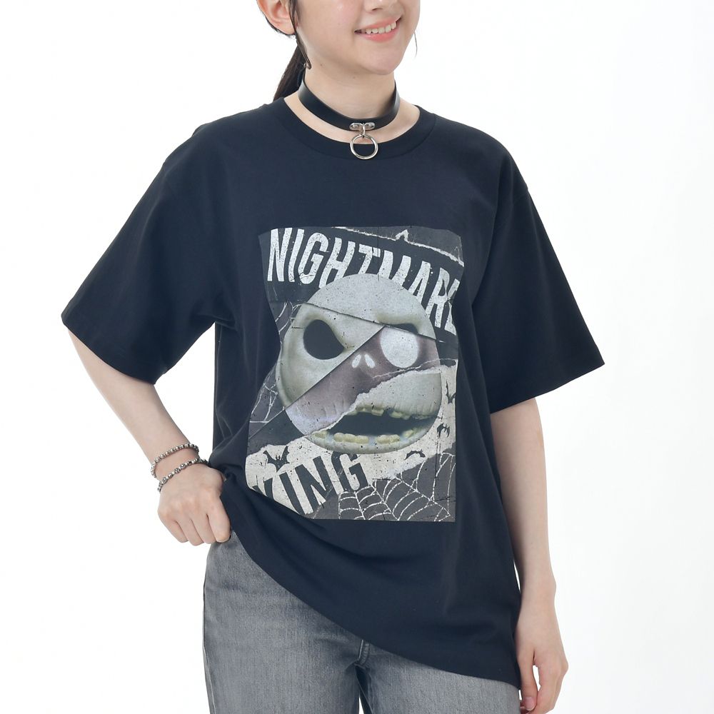 やや厚手の黒Tシャツに、『ティム・バートン ナイトメアー・ビフォア・クリスマス』をモチーフにしたスプーキーなアートをプリント。