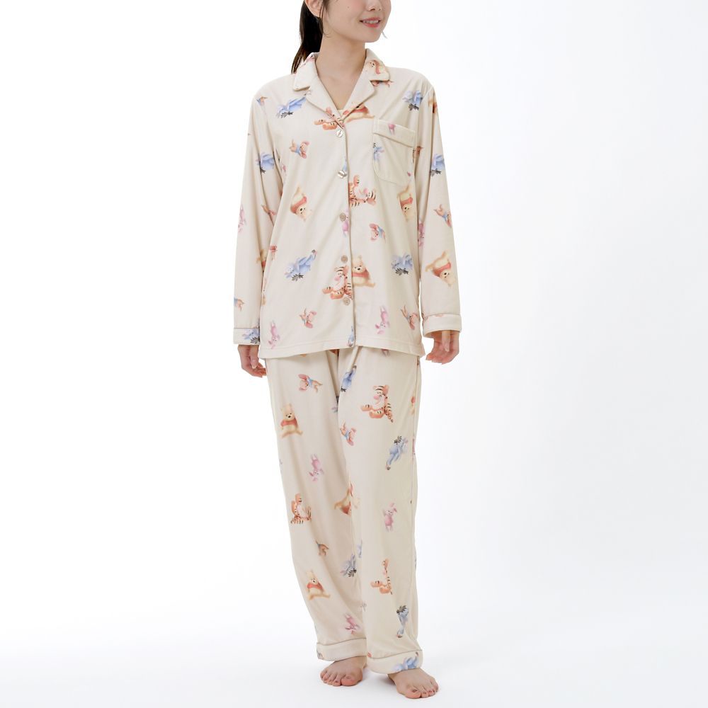 パジャマのプリント生地には、プーさん、ティガー、ピグレット、イーヨー、ルーが描かれています。