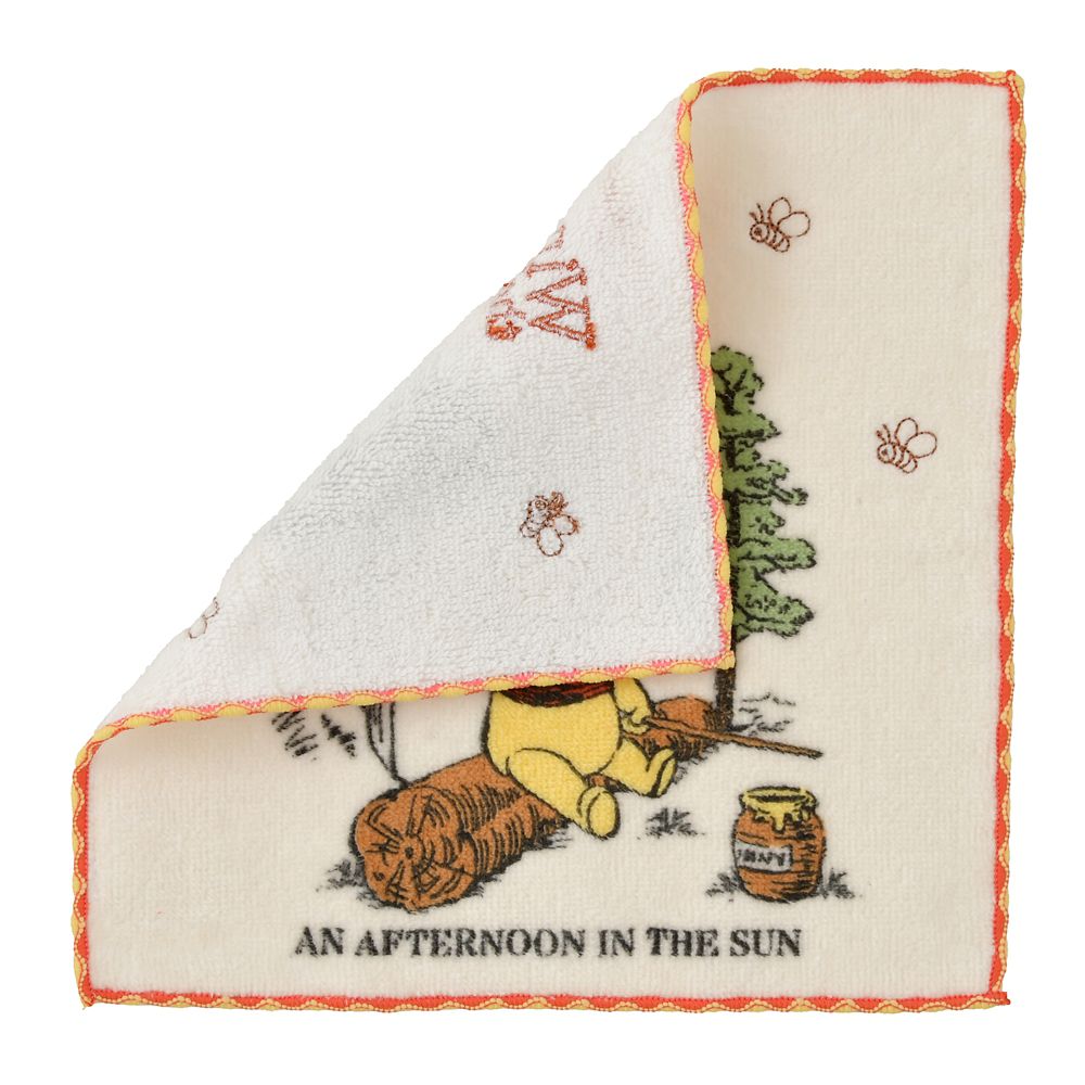 作品ロゴの入ったクラシカルなプリントと組み合わせて、飛んでいるミツバチたちのさりげない刺しゅうがポイント。タオル縁のメローは2色の糸で可愛い模様になっています♪