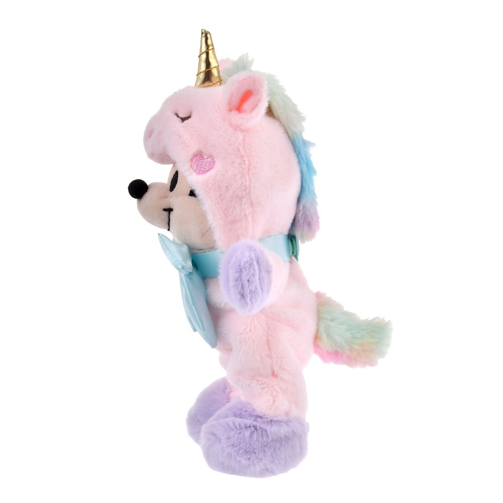 ふわふわボディのユニコーンデザイン。淡いピンク色に、虹色グラデーションのたてがみとしっぽ、首元の大きなリボンがキュートです。