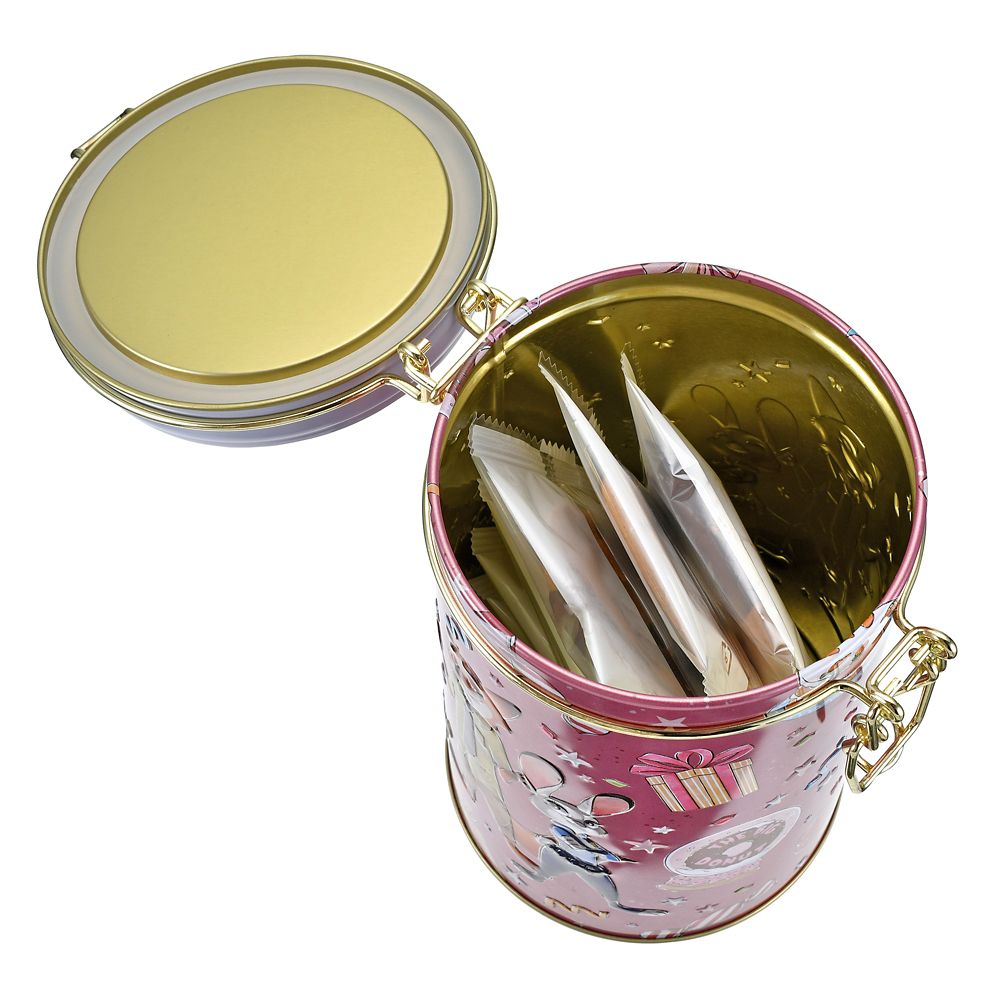 スノードームやキャンディーなどの楽しいモチーフにきらめき感を添えた素敵なキャニスター缶。