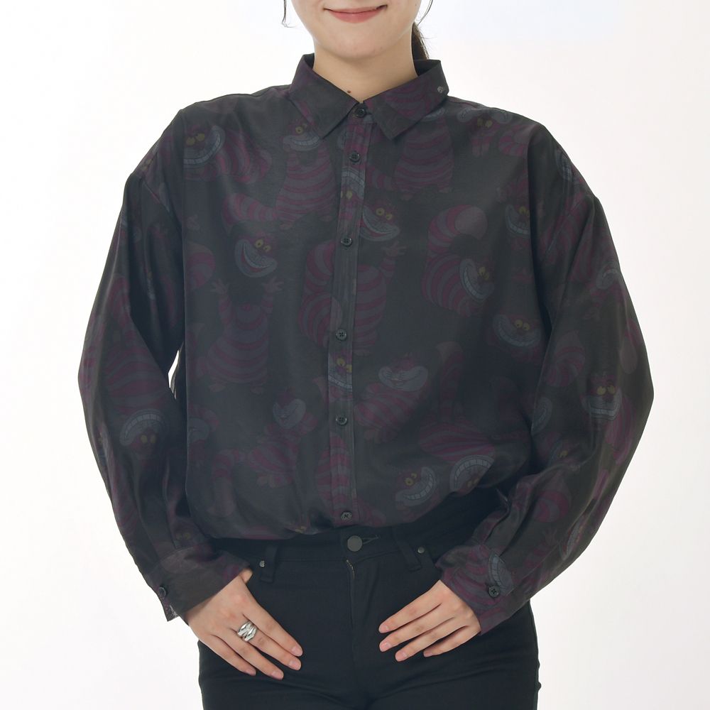 『ふしぎの国のアリス』に登場するいたずら好きのふしぎなネコ、チェシャ猫のデザイン。総柄のプリントシャツ。