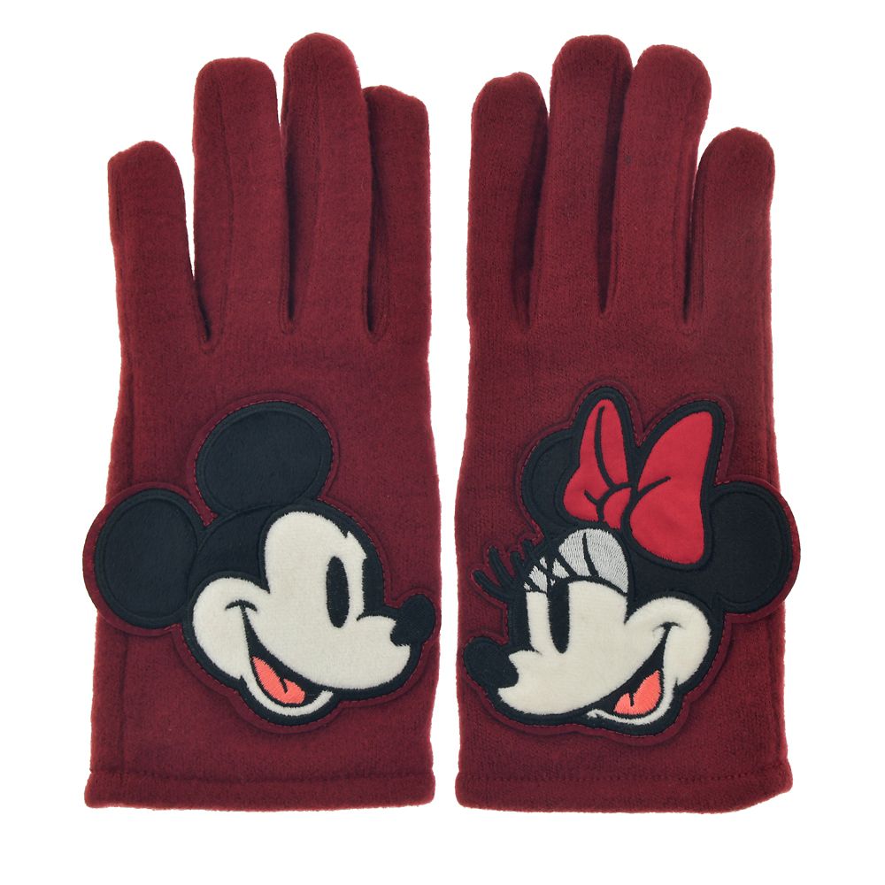 ディープカラーの手袋にレトロチックなキャラクターフェイスをオン。左手にミッキー、右手にミニーのアップリケをあしらいました。