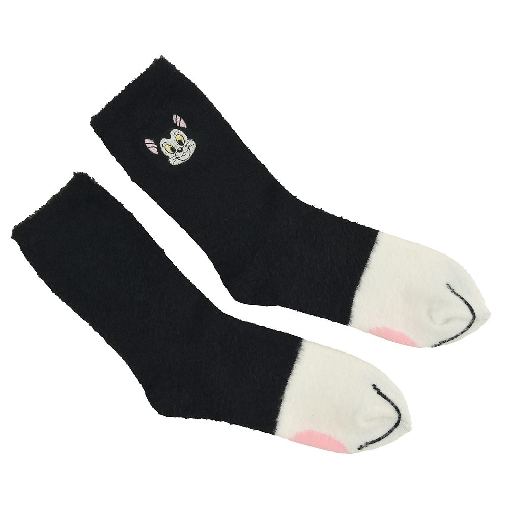 黒猫のフィガロの毛並みのようなシャギー素材の靴下でキャラクターの足を表現。つま先はフィガロの足先、足裏にはピンク色の肉球がデザインされています。